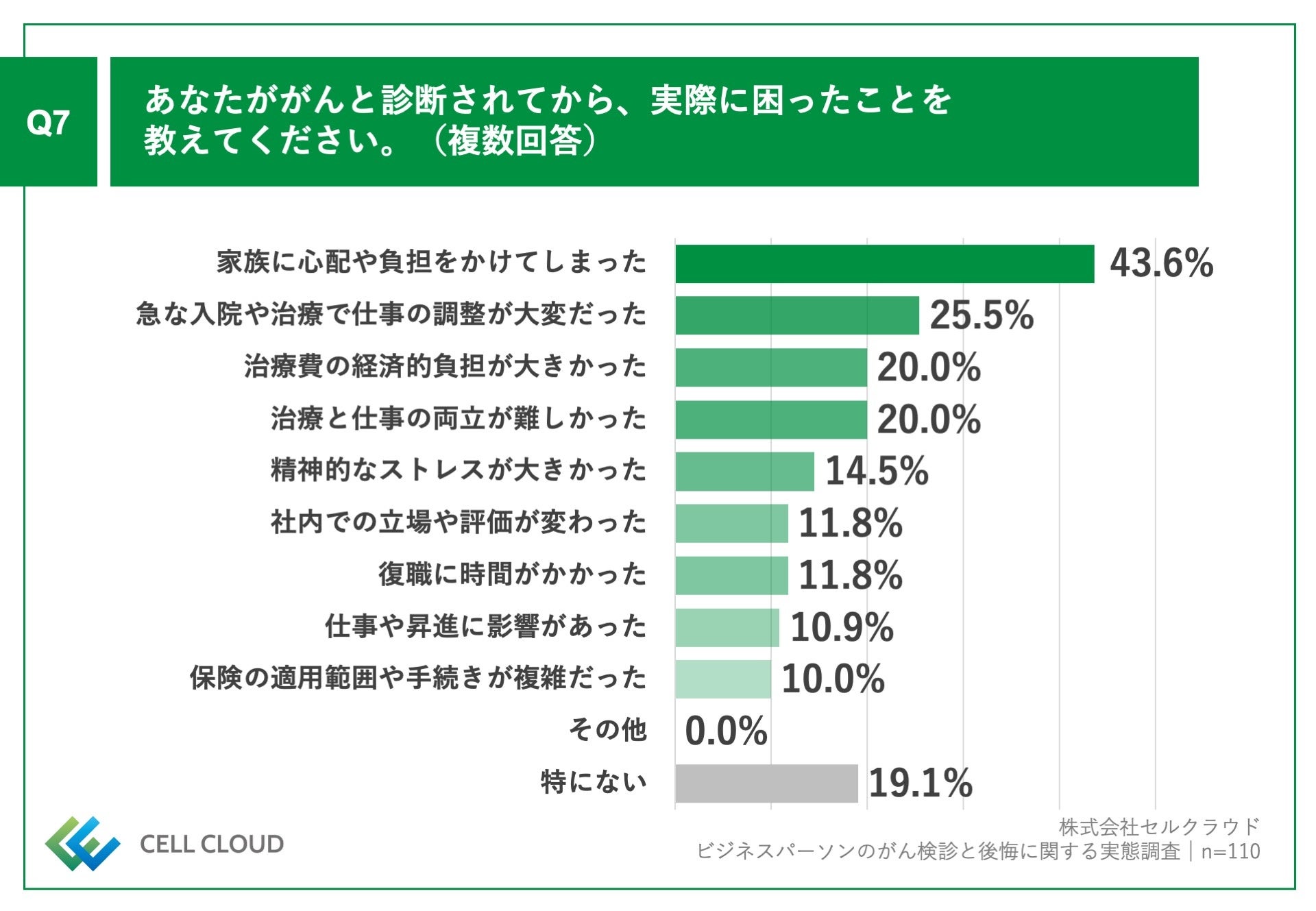 「Q7.あなたががんと診断されてから、実際に困ったことを教えてください。(複数回答)」(n=110)と質問したところ、「家族に心配や負担をかけてしまった」が43.6%、「急な入院や治療で仕事の調整が大変だった」が25.5%という回答となりました。
