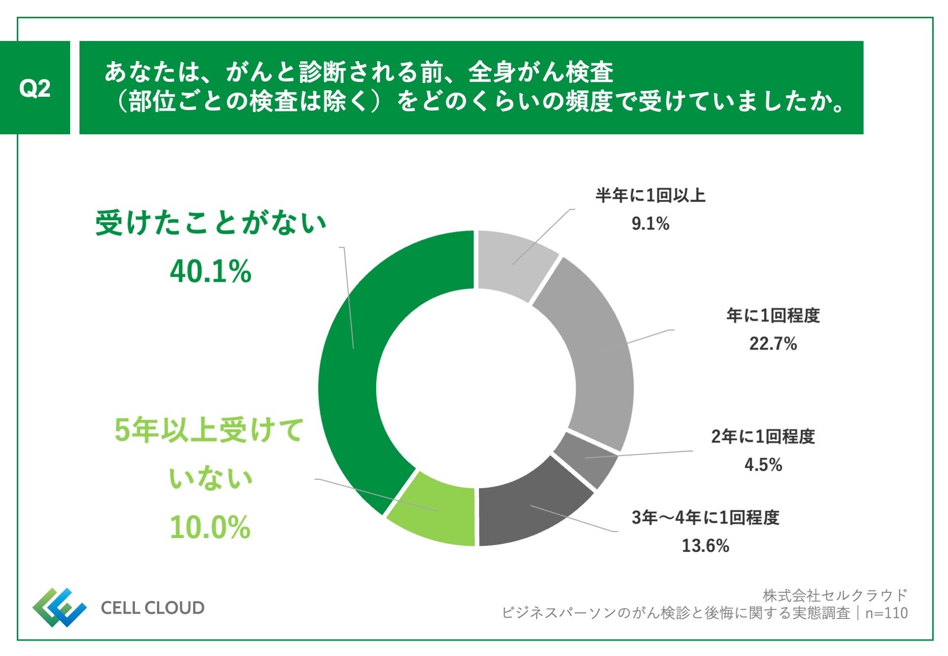 「Q2.あなたは、がんと診断される前、全身がん検査(部位ごとの検査は除く)をどのくらいの頻度で受けていましたか。」(n=110)と質問したところ、「受けたことがない」が40.1%、「年に1回程度」が22.7%という回答となりました。