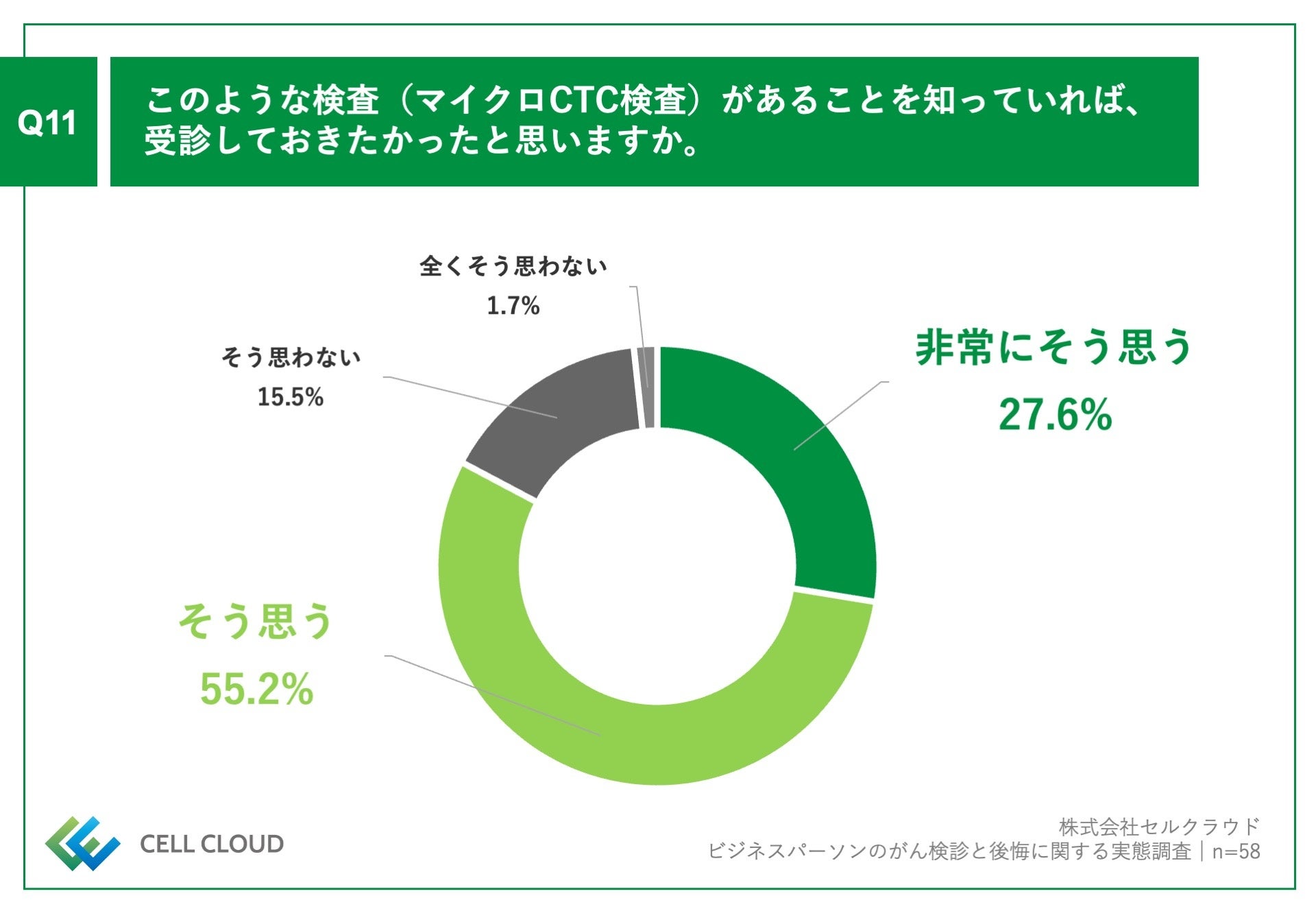 Q10で「知らない」と回答した方に、「Q11.このような検査(マイクロCTC検査)があることを知っていれば、受診しておきたかったと思いますか。」(n=58)と質問したところ、「非常にそう思う」が27.6%、「そう思う」が55.2%という回答となりました。