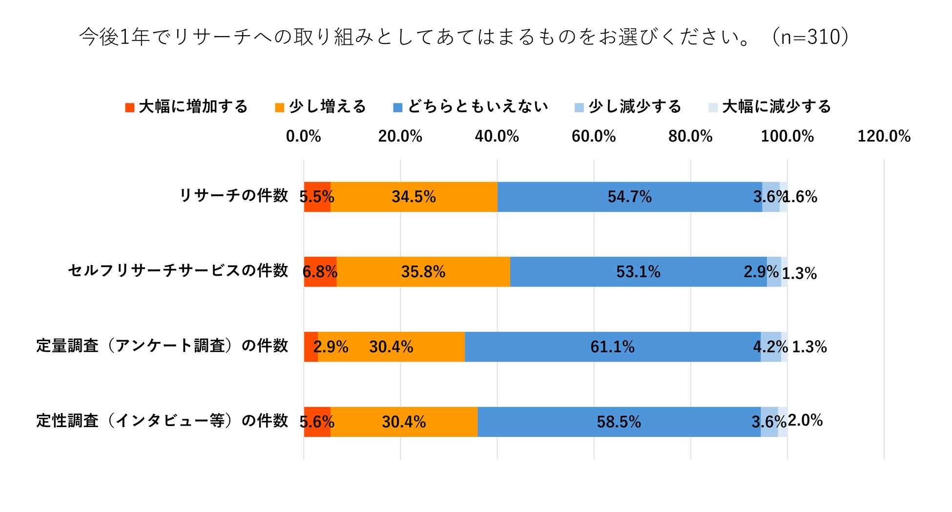 今後1年のリサーチに関する取り組みについての質問では、40.0%のユーザーが増加、セルフリサーチサービスの活用については、42.6%のユーザーが増加すると回答しています。調査手法別では、定量調査が33.3%、定性調査が36.0%が増加するとの回答となりました。