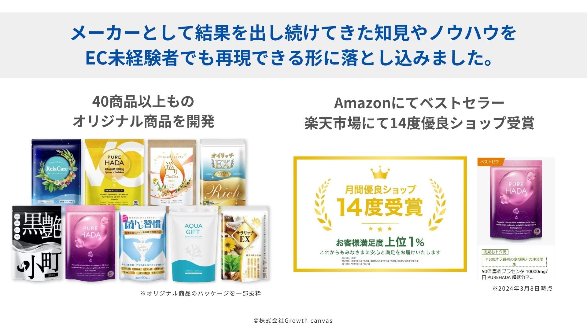 当社は創業9期目を迎えるEC事業者として、商品の企画から販売・運営までを一貫して手がけてきました。これまでに販売してきたオリジナル商品は40商品を超え、机上の理論ではなく、現場で成果を出すための実践ノウハウを蓄積しています。