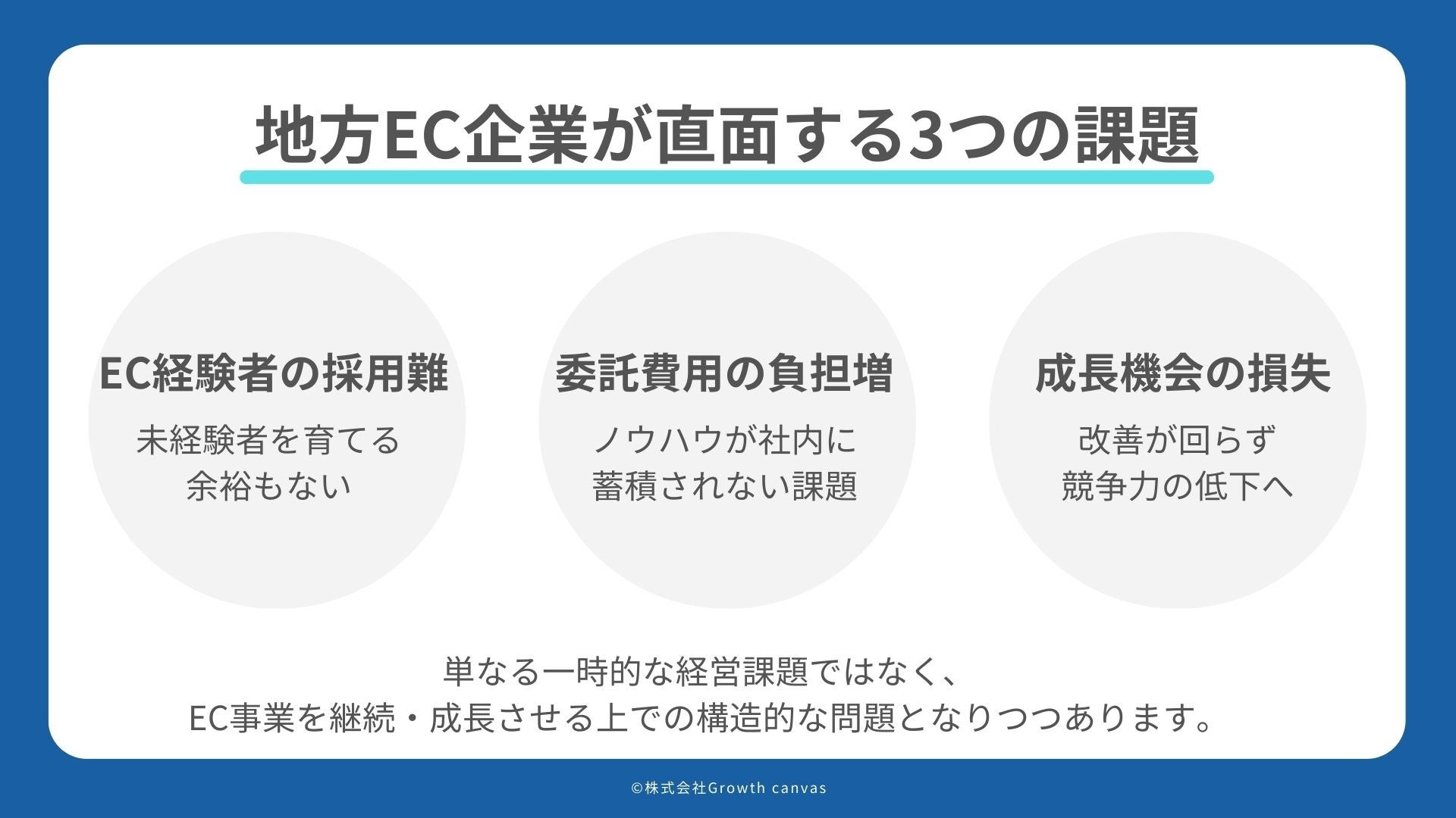 EC市場が拡大を続ける一方で、こうした人材・体制面の課題を抱える地方企業ほど、成長機会を逃しやすい状況にあるのです。