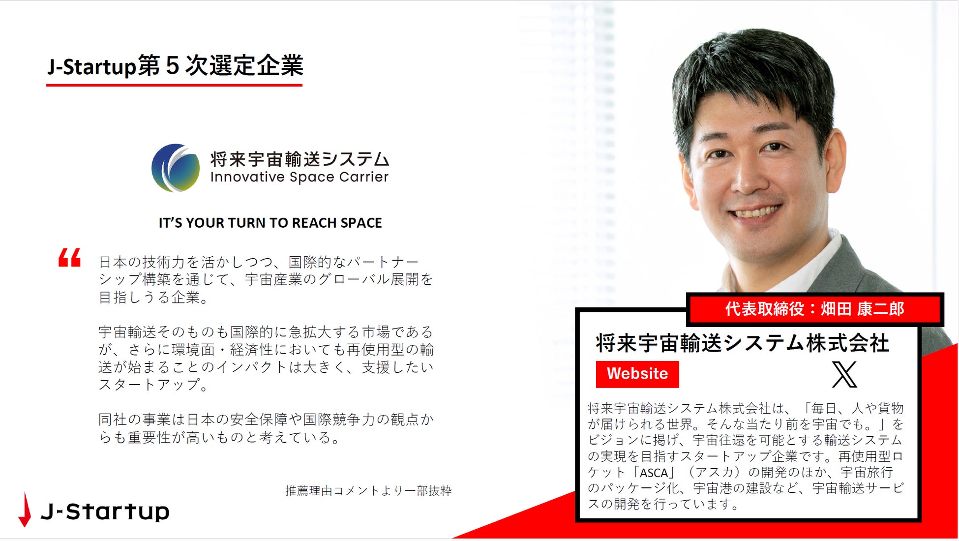 将来宇宙輸送システム株式会社は、「J-Startup」の第5次選定企業に選出されました