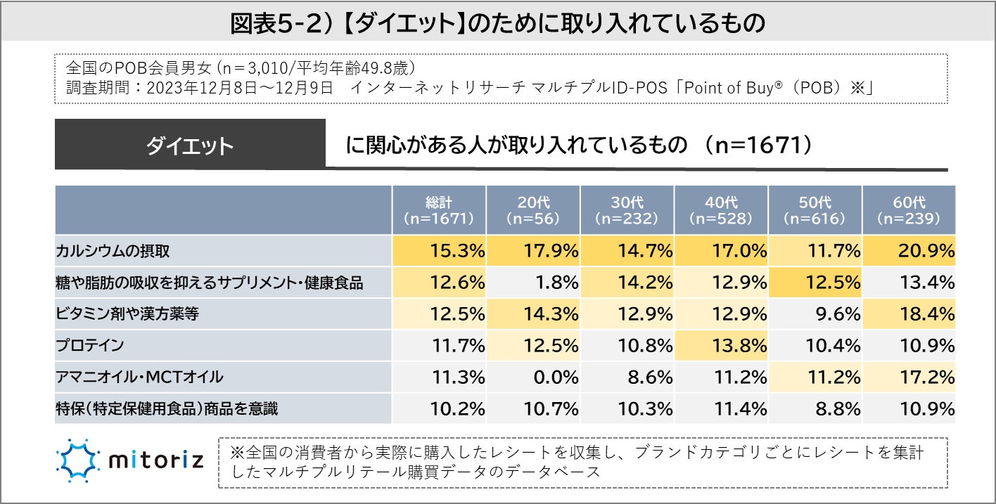 ダイエットへの関心が高い人も「カルシウム(15.3%)」を最も取り入れており、次に「糖や脂肪の吸収を抑えるサプリメント・健康食品(12.6%)」「ビタミン剤や漢方薬等(12.5%)」が続きました。「糖や脂肪の吸収を抑えるサプリメント・健康食品」は20代はかなり低く、30代から取り入れられているようです。50-60代は他世代より「アマニオイル・MCTオイル」の順位が高くなっています(図表5‐2)。