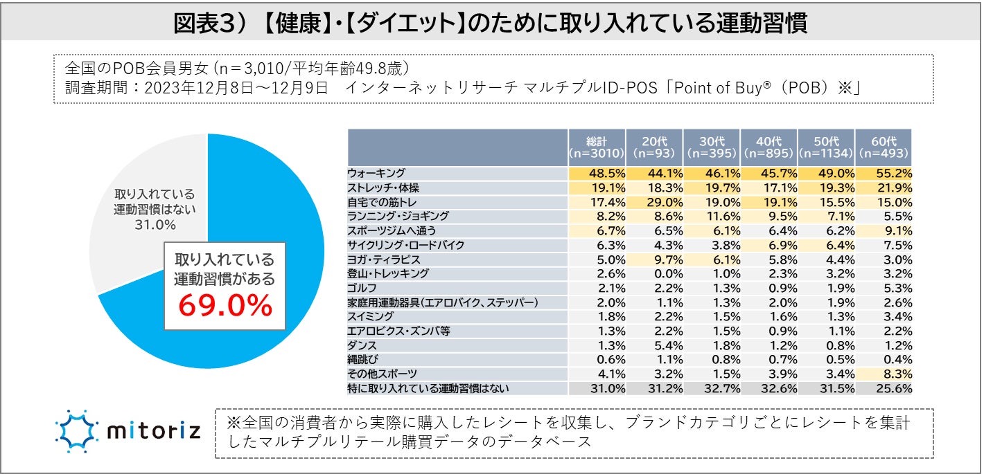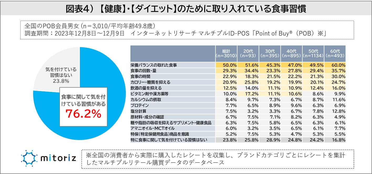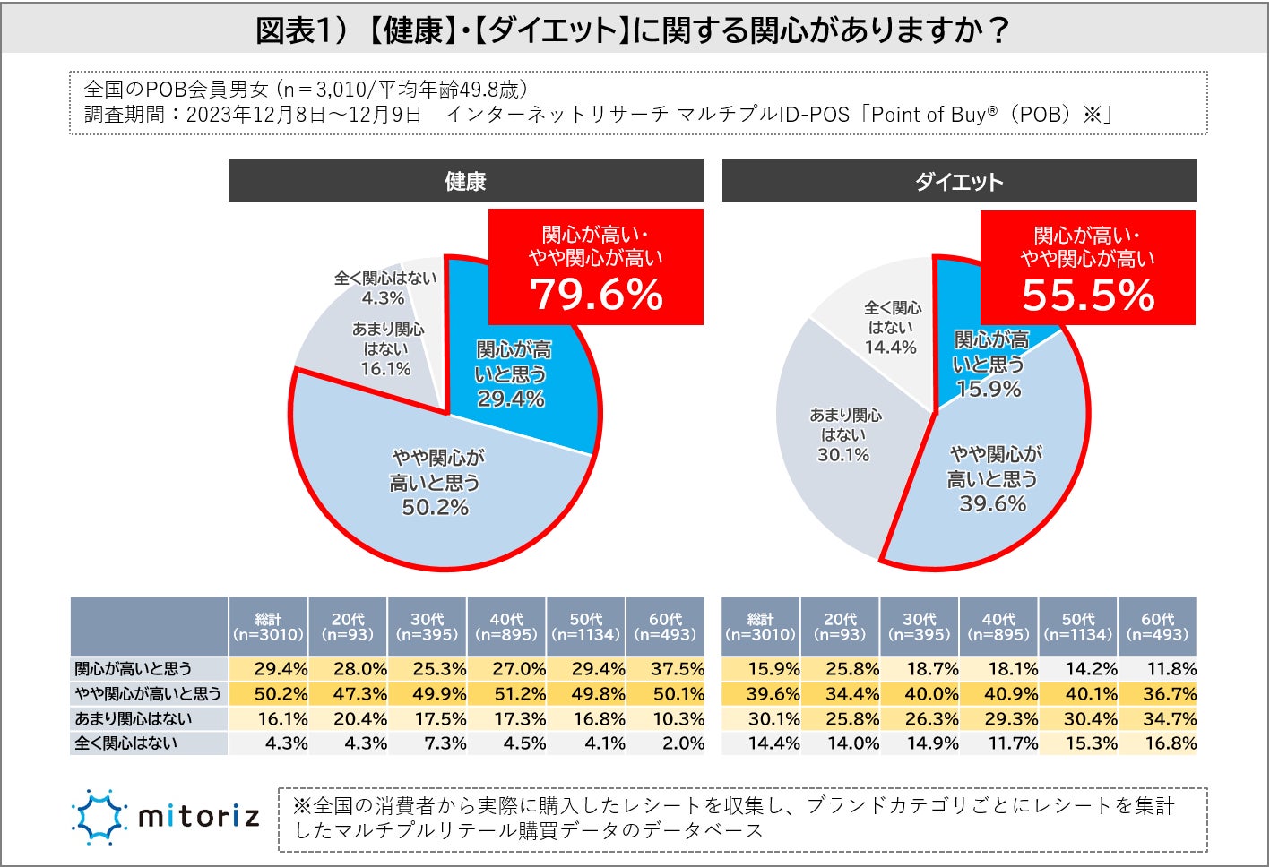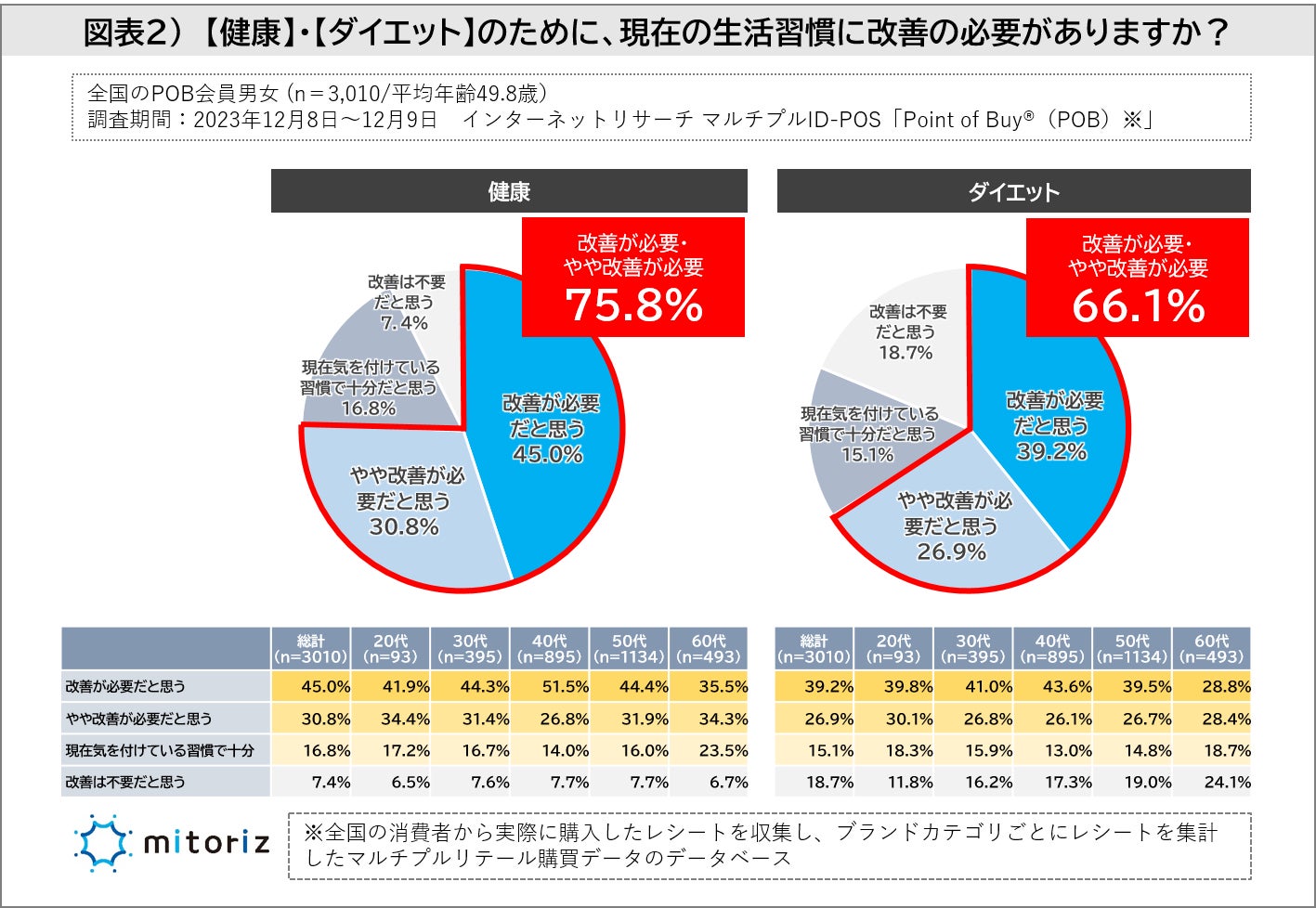 株式会社mitoriz(本社:東京都港区、代表取締役社長:木名瀬博)は、消費者購買行動データサービス「Point of Buy®(以下、POB)」の会員3,010人に「健康とダイエットに関する調査」を実施致しました。