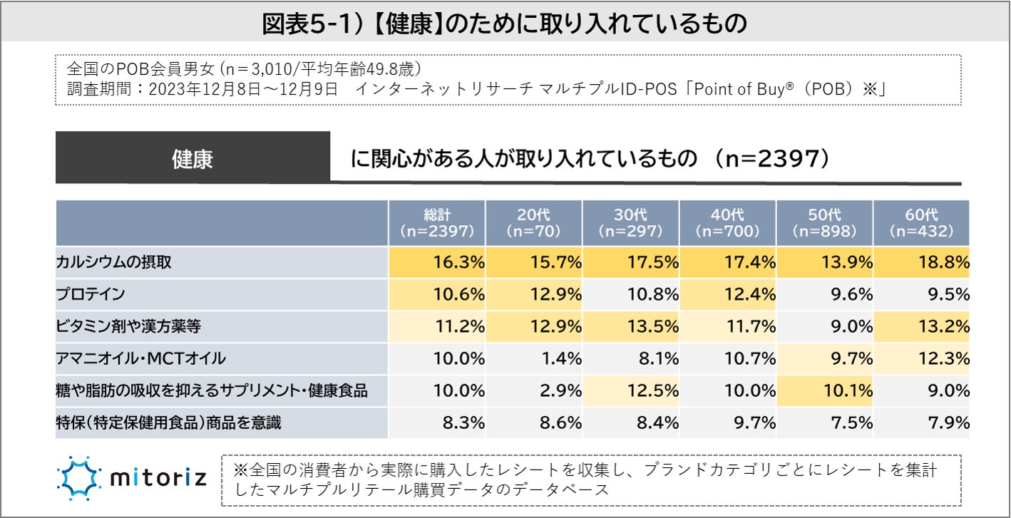 健康への関心が高い人が取り入れているものは「カルシウム(16.3%)」が最も多く、次いで「プロテイン(10.6%)」「ビタミン剤や漢方薬等(11.2%)」と続きました。30代は「プロテイン」より「ビタミン剤や漢方薬等」「糖や脂肪の吸収を抑えるサプリメント・健康食品」が取り入れられ、50-60代は「アマニオイル・MCTオイル」が高くなっています(図表5‐1)。