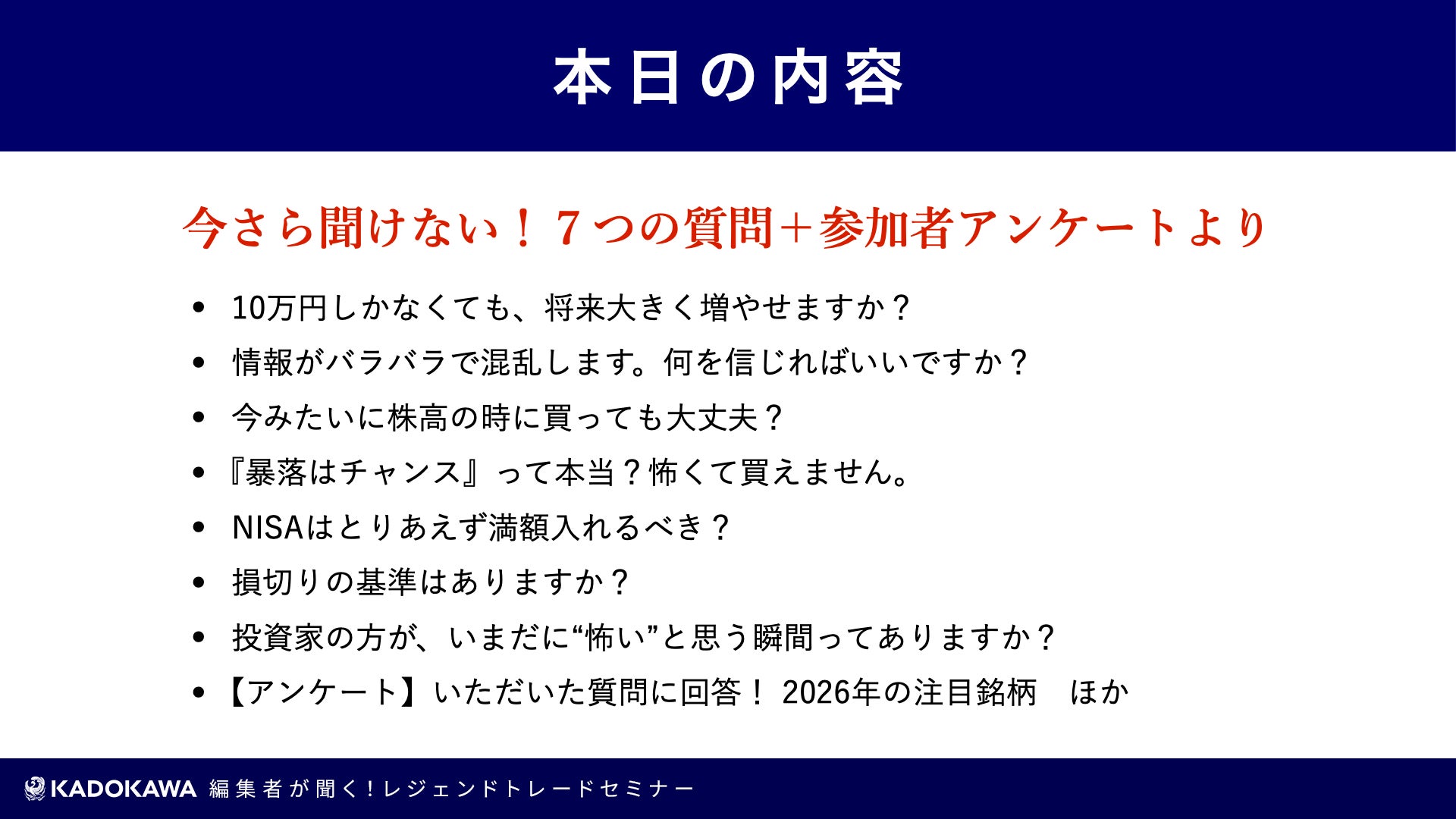 “これからの日本に再現性ある投資を”というミッションを掲げ、金融教育事業を展開する株式会社RES(アールイーエス|住所:東京都千代田区、代表取締役:児玉 一希、以下:当社)は、2025年12月12日(金)にオンラインにて開催された株式会社KADOKAWA主催の「レジェンドトレードセミナー」に、当社と講師契約を結ぶ現役億トレーダーMr.K氏、当社代表の児玉が登壇したことをお知らせいたします。
