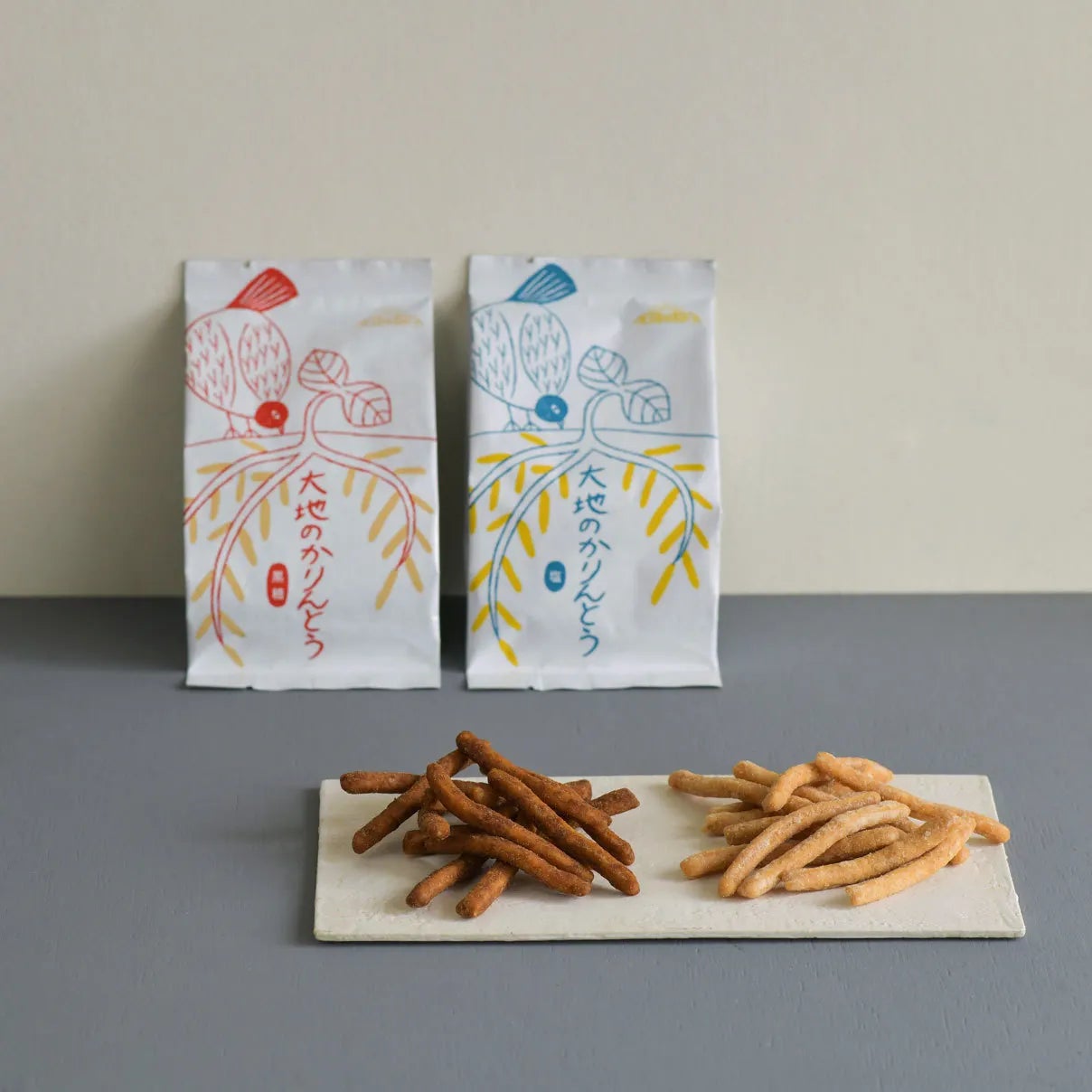 北海道産石臼挽き小麦全粒粉、岐阜県産小麦粉、平飼い有精卵、粗糖などの厳選素材を使用し、国産米油で一本一本丁寧に手揚げ。"大地"のような力強さと優しさを持つ素材感あふれるかりんとうです。「黒糖」と「塩」の2種類をご用意しています。