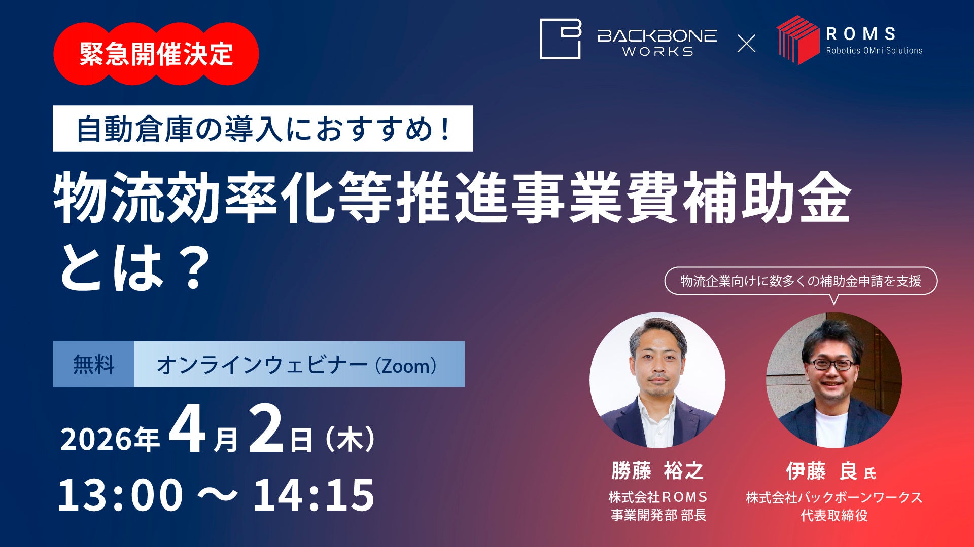 物流倉庫や工場向けに自動化ソリューションを提供する株式会社ROMS(本社:東京都品川区、代表取締役:前野洋介)は、『【緊急開催】自動倉庫の導入におすすめ!物流効率化等推進事業費補助金とは?』の開催を決定、お申し込みを開始しましたのでお知らせいたします。