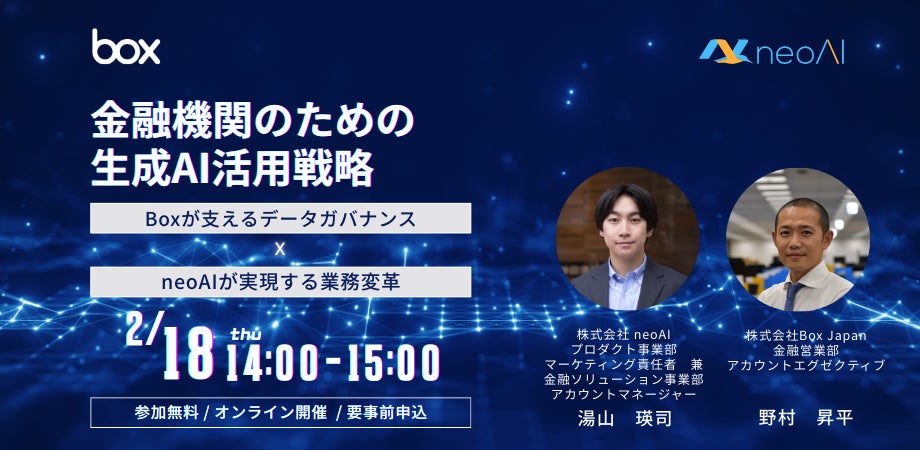 【2/18(木)14:00-15:00 オンライン】金融機関のための生成AI活用戦略― Boxが支えるデータガバナンス × neoAIが実現する業務変革―