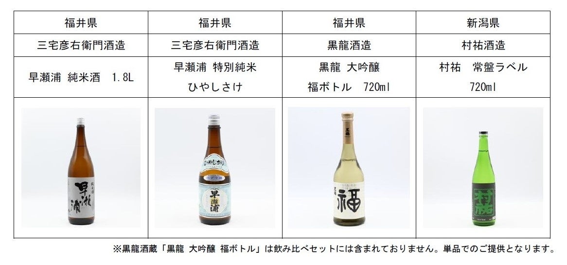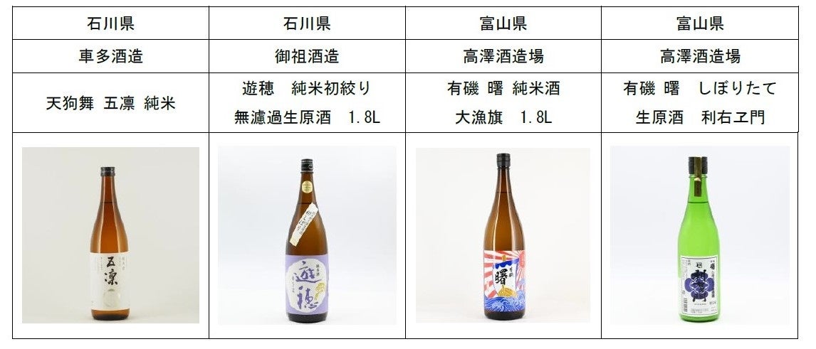〇フェア期間中は北陸4県(石川県・富山県・福井県・新潟県)のお酒8種類を取りそろえ、単品、並びに3種類の飲み比べセットをお楽しみいただけます。