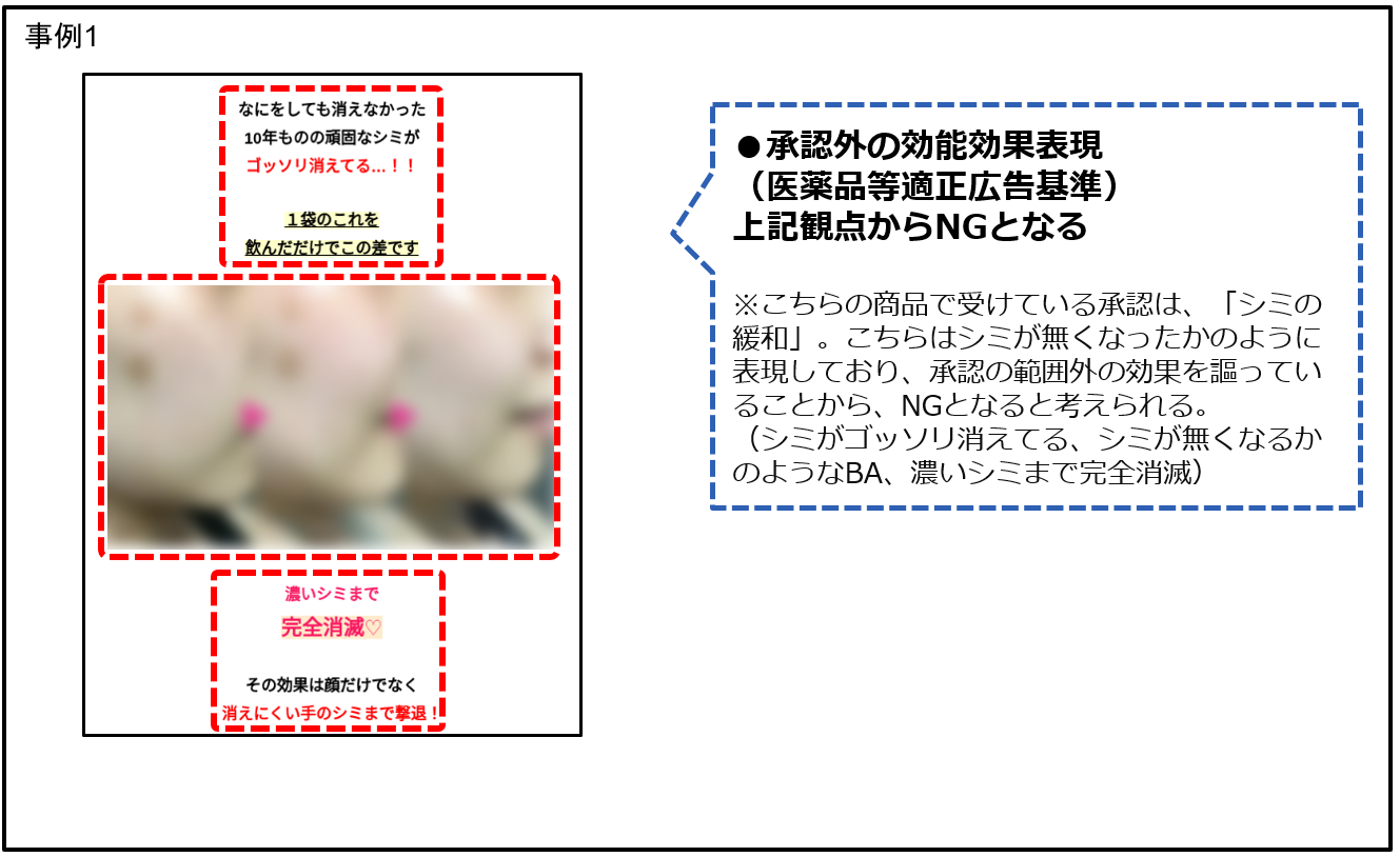 例4:しみに関する商材において、シミが消えた、シミが消滅、シミが無かったように、シミの洗剤/漂白剤、画像との組み合わせでシミがキレイになるような表現。