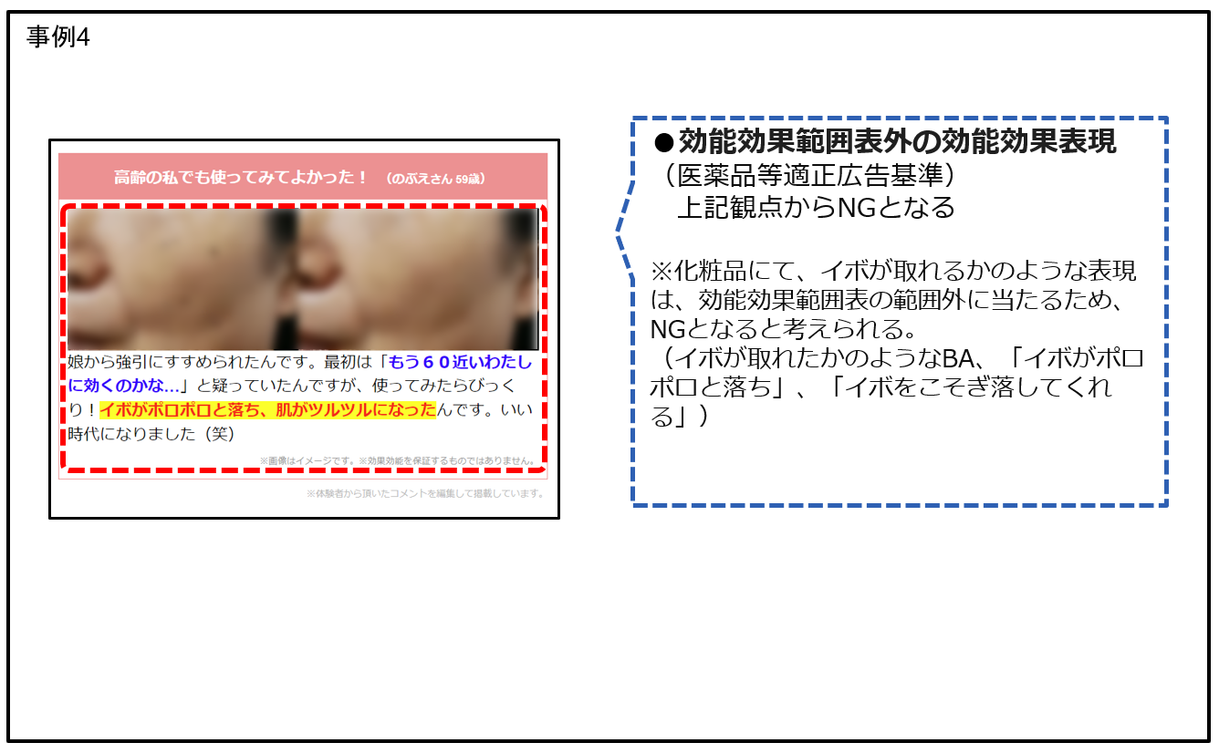 例10:化粧品(薬用化粧品含む)に該当する商材について、その他謳うことのできない効果があるかのような表現。皮膚のたるみを解消する、ポツポツをケアする、細胞を含めて若返らせる、アンチエイジング効果がある、などの表現。
