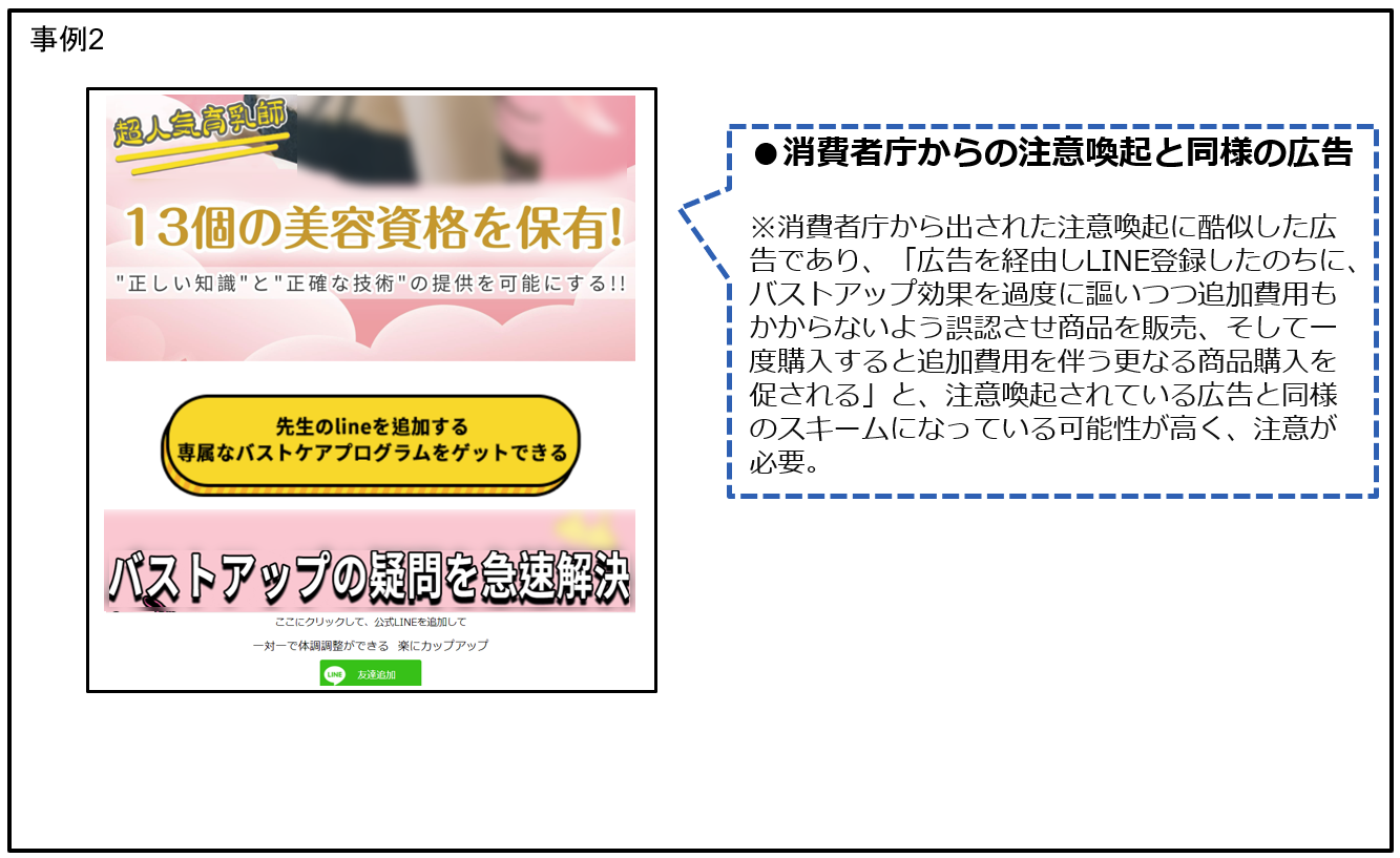 b. 過度の痩身効果もしくはバストアップ効果、並びに追加費用がかからない旨を謳い、LINE登録を勧誘する広告(消費者庁が注意喚起している内容に酷似した広告)