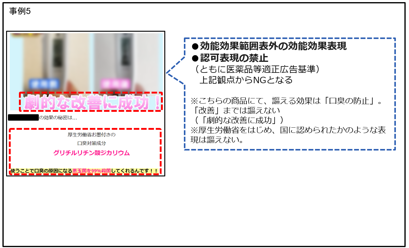 その他、薬機法や景表法以外の法令等に違反している表現や、消費者庁から過去に指摘/注意喚起されている表現