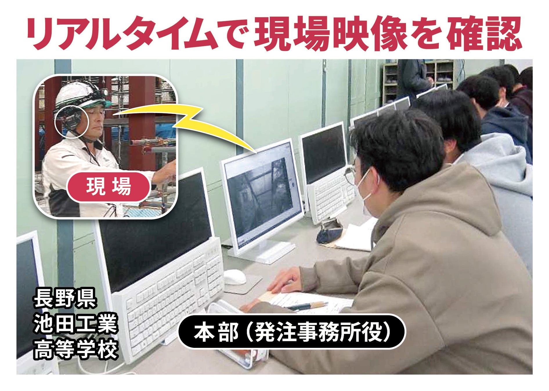 今回は、取組の一環として実施された職場体験学習会の中で、遠隔臨場を体験してもらうため、建設現場にいる工事施工者(株式会社傳刀組 スタッフ)がザクティのウェアラブルカメラCX-WEシリーズをヘルメットに装着し目線映像を配信、その映像を生徒がそれぞれのPCで確認し、工事現場の状況確認や現場との情報共有を行いました。