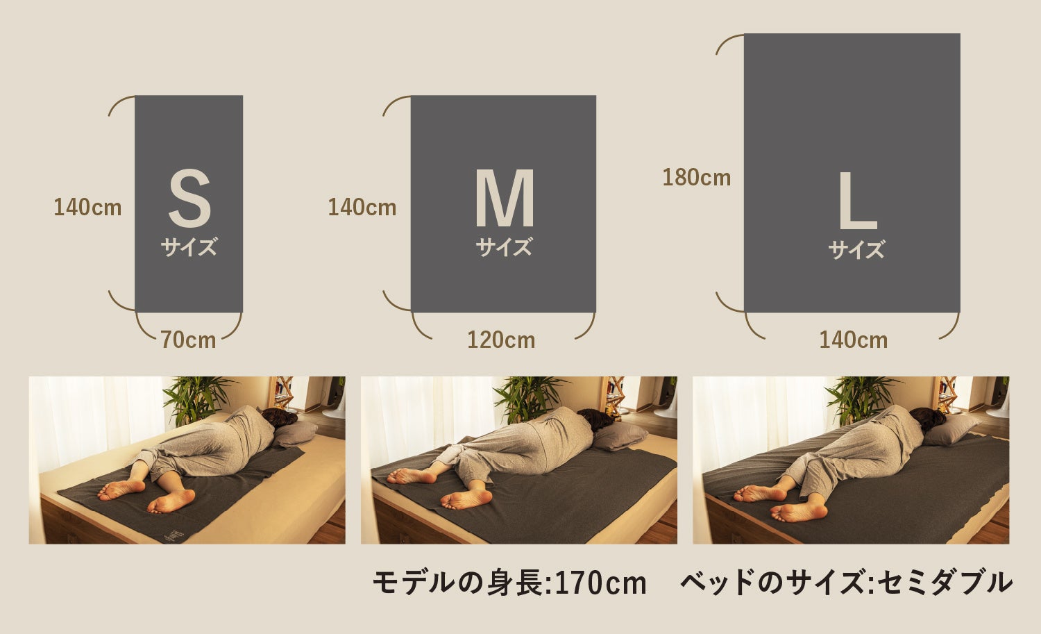 既存のBED MASKは女性ひとりが横になるのに適したサイズだったところを、お客様のご要望にお応えし、男性や二人でもゆったりとお使いいただけるよう、既存のものをSサイズとし、MサイズとLサイズの2サイズを追加展開しました。