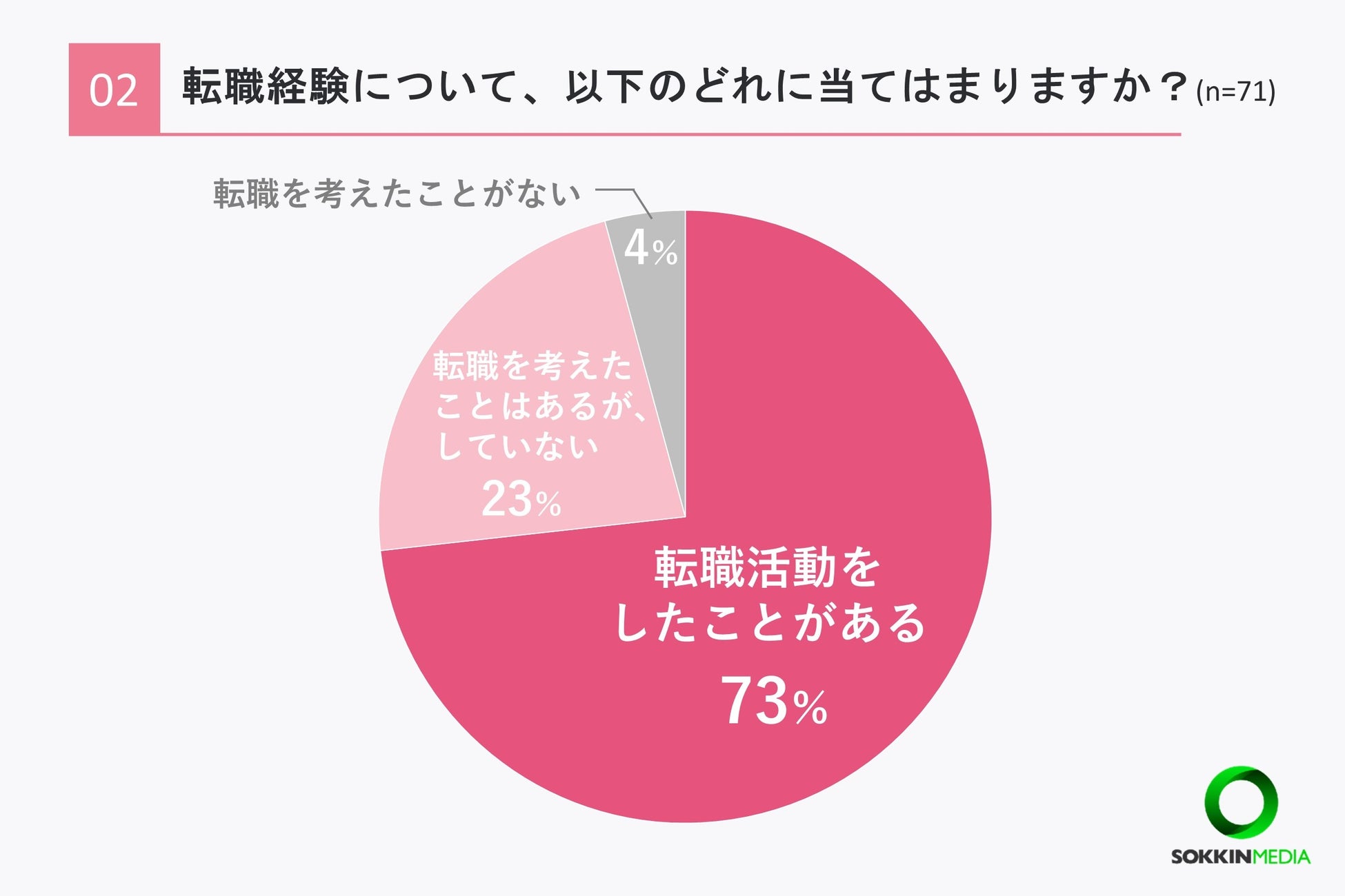 「Q2.転職経験について、以下のどれに当てはまりますか?」という問いに対して、「これまでに転職を考えたことがあり、実際に転職活動をしたことがある」と答えた方が最も多く73%に上り、ついで「これまでに転職を考えたことがあるが、転職活動はしなかった」という回答が23%という結果になりました。