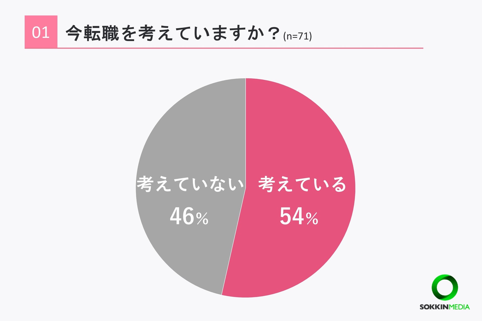 「Q1.今転職を考えていますか?」という問いに対して、「今転職を考えている」と答えた方が最も多く、54%に上りました。