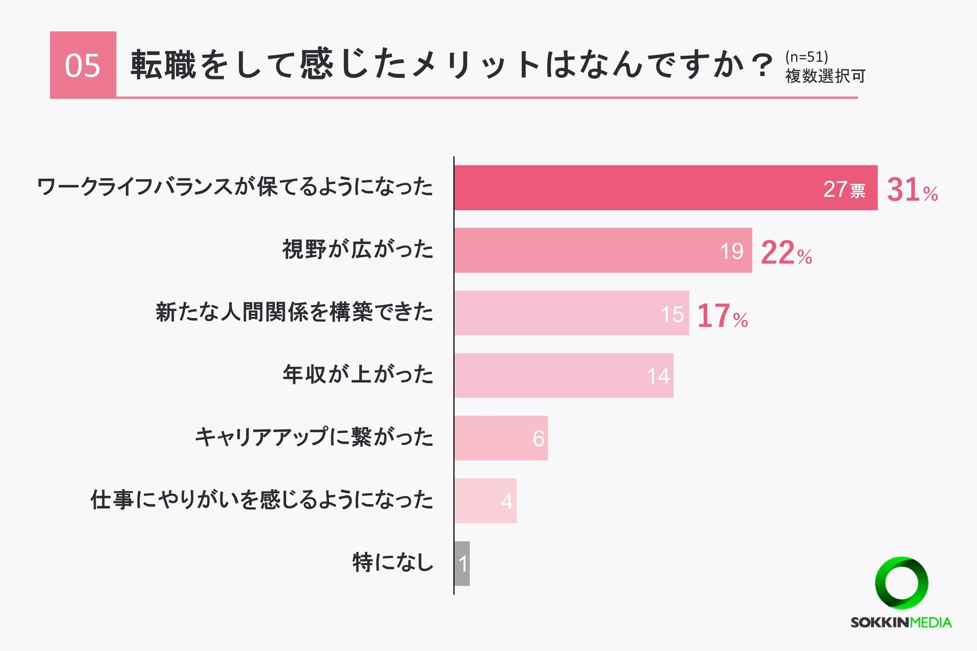 これまでに転職をしたことがあると答えた方のみに行った「Q5-1.転職して感じたメリットはなんですか?」という問いに対して、「ワークライフバランスが保てるようになった」が最も多く挙げられ31%となりました。次いで、「視野が広がった」という回答が22%となっています。