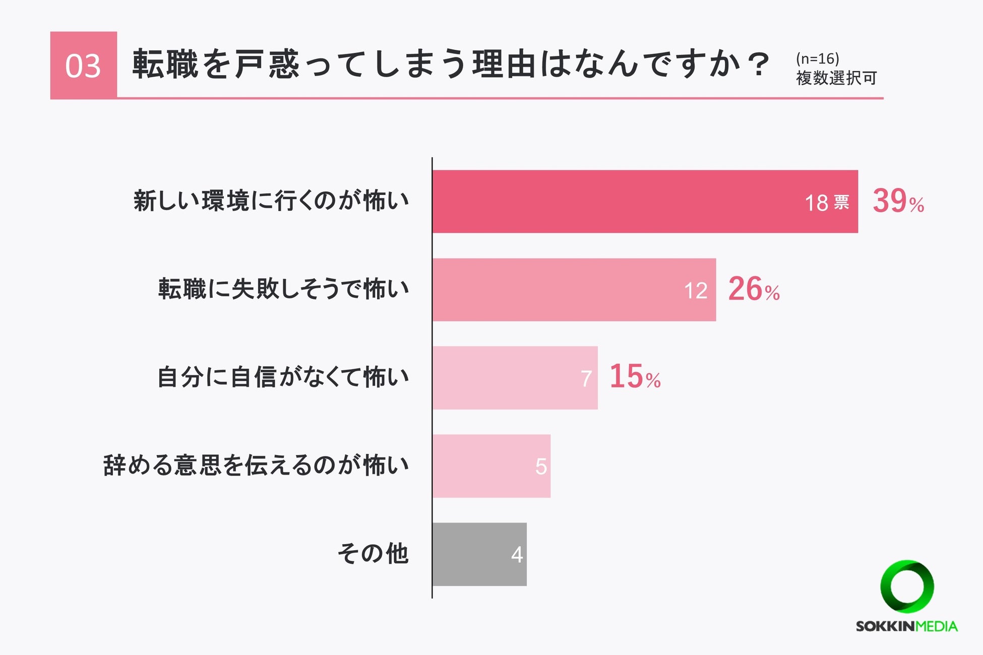 質問4で、「これまでに転職を考えたことがあるが転職活動はしなかった」と回答した方のみ対象の「Q3-1.転職を戸惑ってしまう理由はなんですか?」という問いに対して、「新しい環境に行くのが怖い」と答えた方が最も多く39%となりました。次いで「転職に失敗しそうで怖い」という回答が26%となっています。