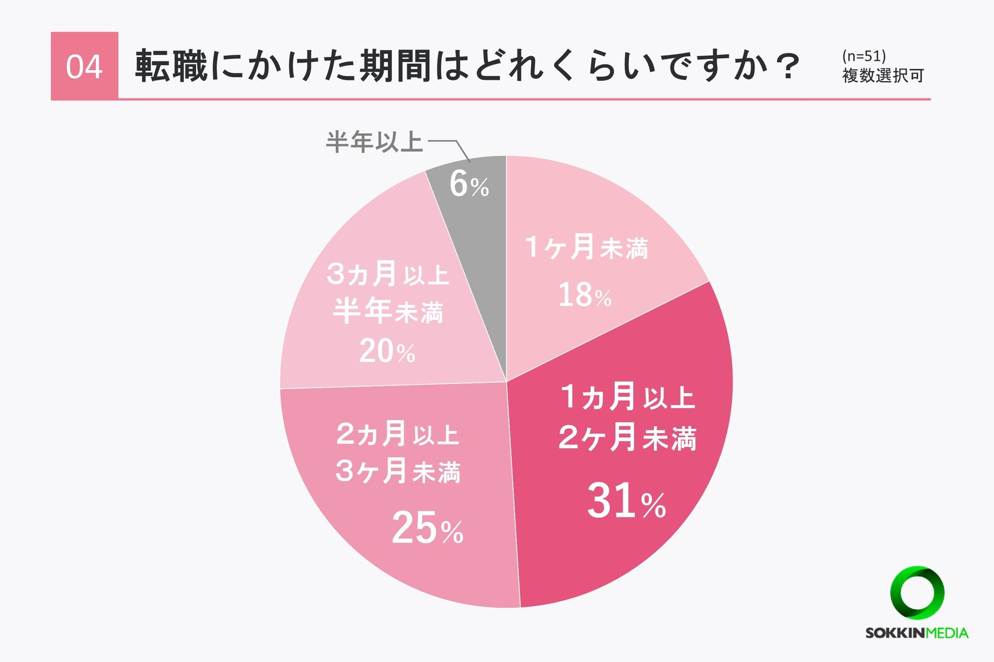 これまでに転職をしたことがあると答えた方のみに行った「Q4.転職活動にかけた期間はどれくらいですか?」という問いに対して、「1ヵ月以上2ヶ月未満」と答えた方が最も多く、31%という結果になりました。
