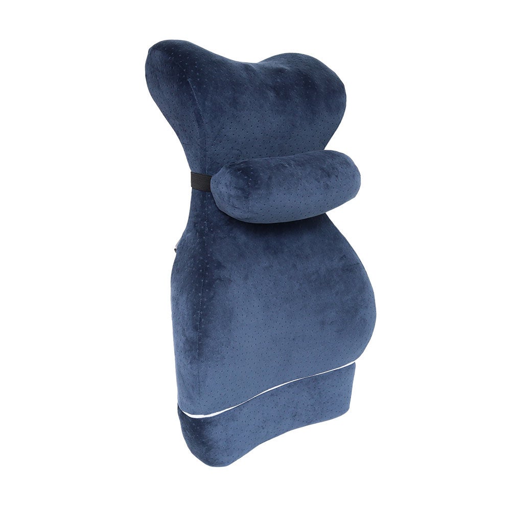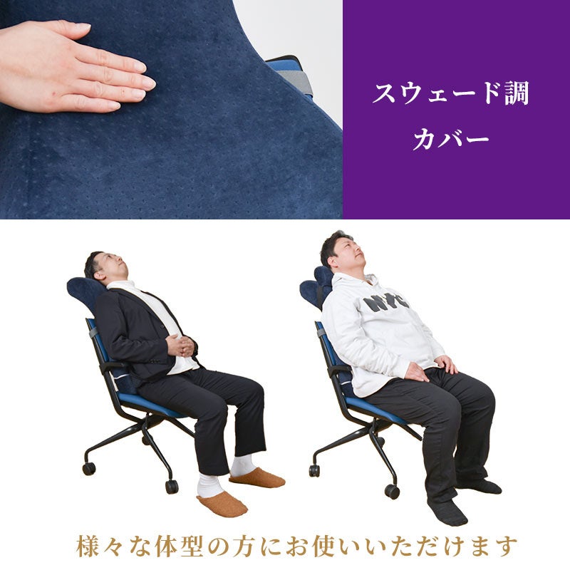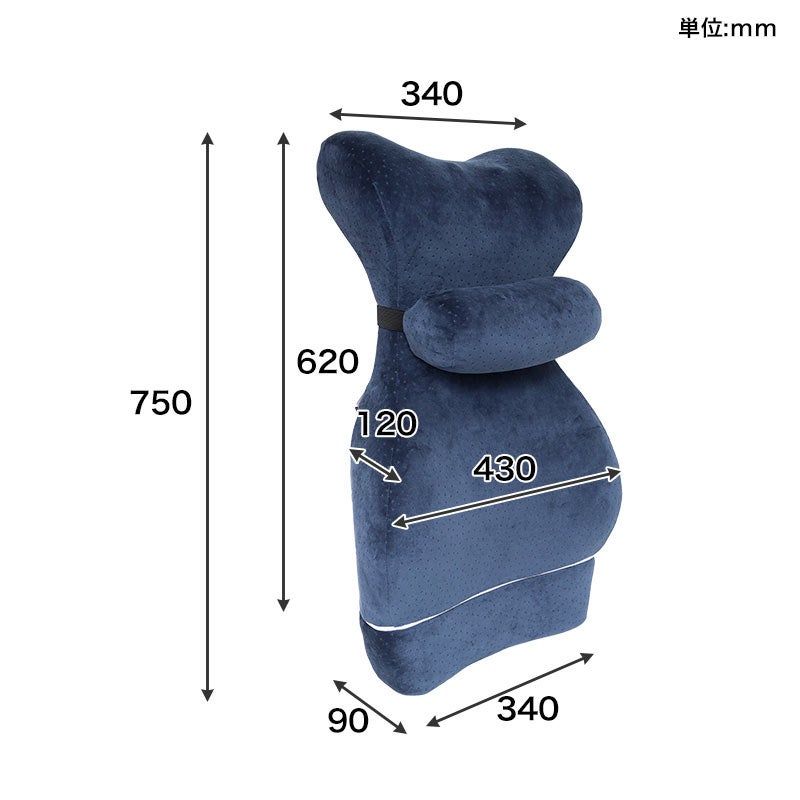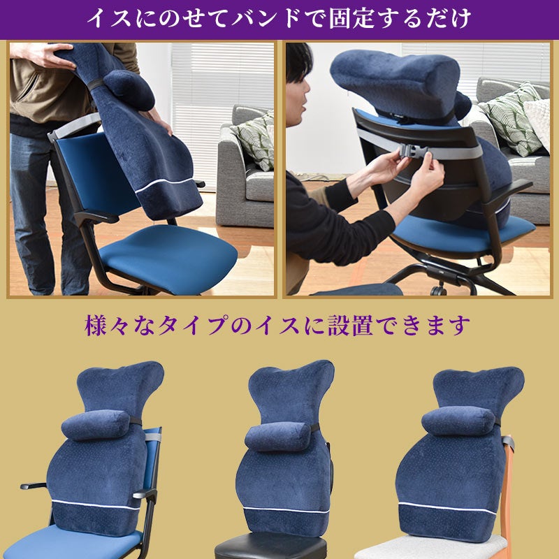 幅430×奥行120×高さ750mm。背面のベルトでお手持ちのイスに固定。オフィスチェアやダイニングチェア、座椅子などにも取り付けできます。本体下部分がファスナーで取り外すことができ2段階の高さ調整が可能(75cm、62cm)。低反発ウレタンを採用。厚み約12cmでしっかりと体を支えてリラックスできます。ベルトで固定するマクラ付き。イスで使う以外にもソファに置いて使うこともできます。