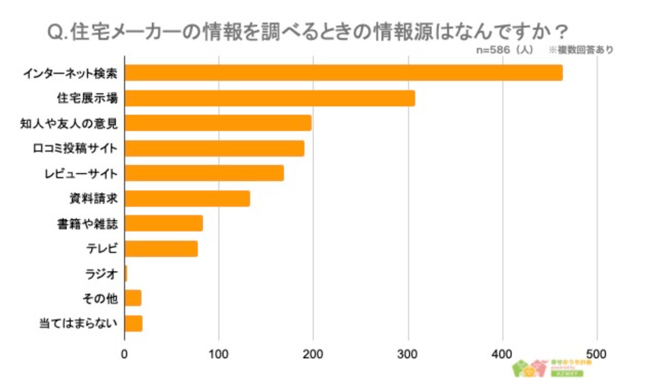 また、「住宅メーカーの情報を得る方法」について聞いたところ、「インターネット検索」が464人で1位という結果に。住宅メーカーの存在を知るきっかけは「CM」が多いものの、実際に詳しい情報を得るのに「インターネット検索」を活用している人が多いとわかりました。また、実際に「住宅展示場」に足を運んで情報を得ている人も307人と多く、インターネットの情報だけでなく、自分の目で見て住宅メーカーを見極めようとしている人が多いとわかりました。