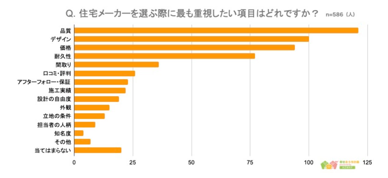 また、「住宅メーカーを選ぶ際に最も重視すること」について聞いたところ、「品質」が121人で1位、2位が「デザイン」で100人、3位が「価格」で94人という結果に。多くの人が品質の高い家を提供しているハウスメーカーに家づくりを頼みたいと考えていることがわかります。一方、知名度を選んだ人はわずか4人で、知名度よりも品質を重視する人が多いとわかります。