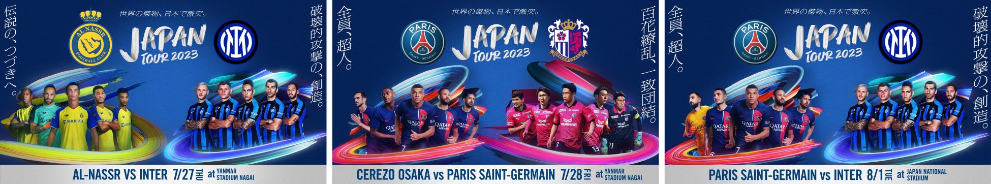 本ツアーは、エムバペ選手・ネイマール選手・マルキーニョス選手・ヴェッラッティ選手・ドンナルンマ選手らが所属するフランスの名門『パリ・サン=ジェルマンFC』が昨年に続いて今夏も来日し、今回は、クリスティアーノ・ロナウド選手らが所属するサウジアラビアの『アル・ナスルFC』と、イタリアの名門『FCインテルナツィオナーレ・ミラノ』も来日。Jリーグからは『セレッソ大阪』が参戦し、4クラブで対戦いたします。