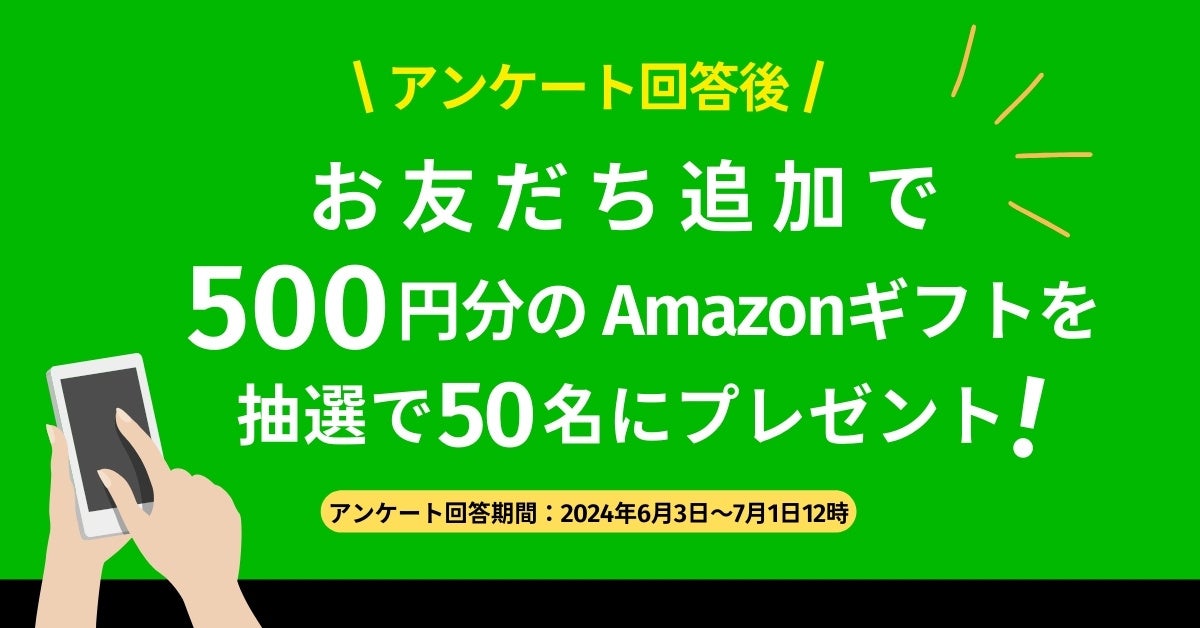 アンケートに回答後、公式LINEにて『お友だち追加』していただいた方から抽選で「500円分のAmazonギフト」をプレゼントいたします。