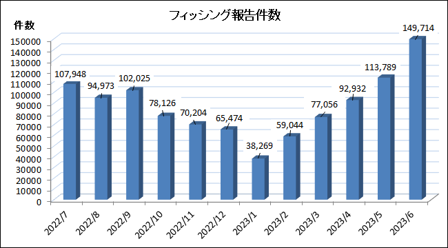 6月におけるフィッシング報告件数は149,714件となり、前月比35,925件増加(約31.6%増加)しています。