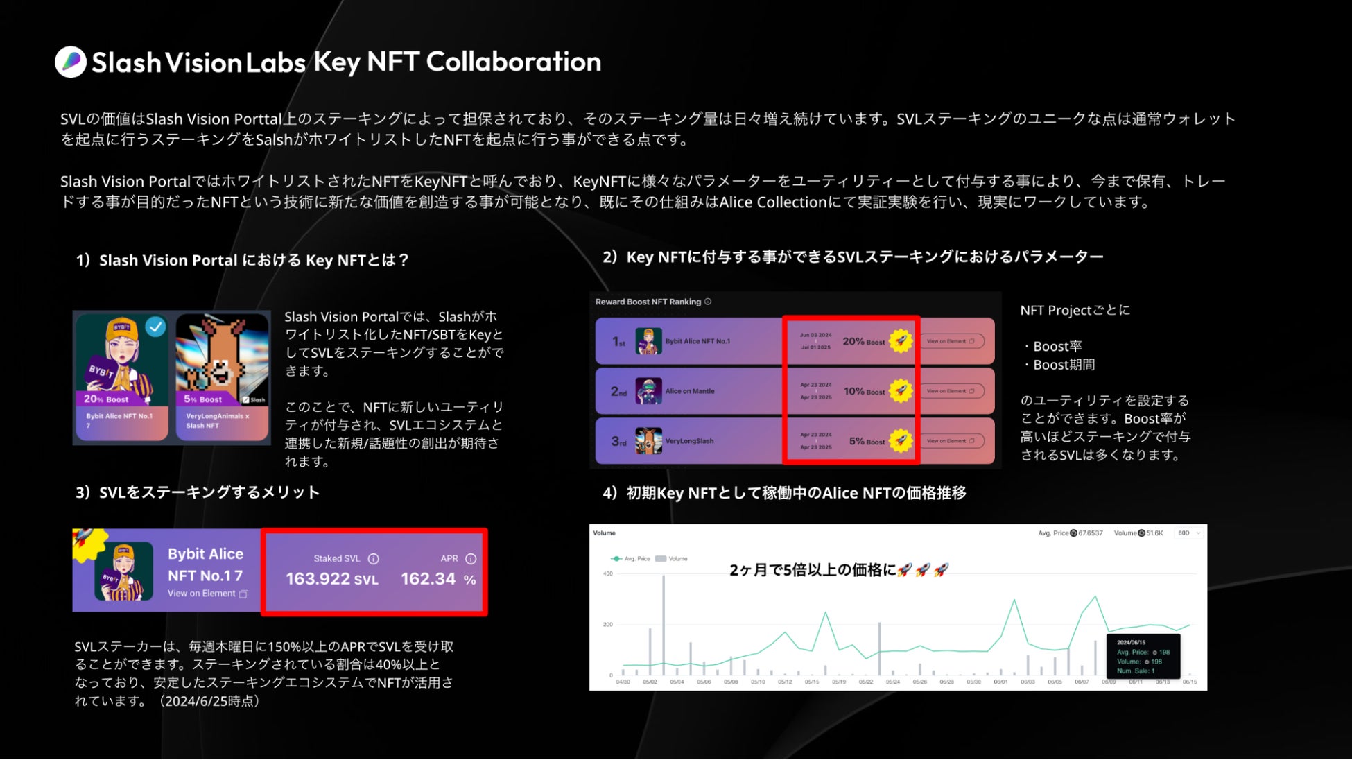 Slash Vision Labsでは、各プロジェクトとSVLエコシステムが連携することで、NFTやTokenの新しいユーティリティの創出が実現できると考えており、Boost NFTによるSVLステーカーへのインセンティブの強化やDiscount poolによる新しいトーケノミクスのあり方など、クリプトを通じた新しい価値創出を今後も推進してまいります。