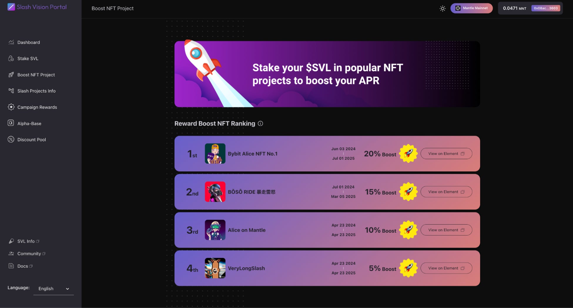 各KeyNFTごとにAPRのBoost率/期間が設定されており、ユーザーはElementなどMantleのNFTマーケットプレイスから各KeyNFTを購入することが可能です。