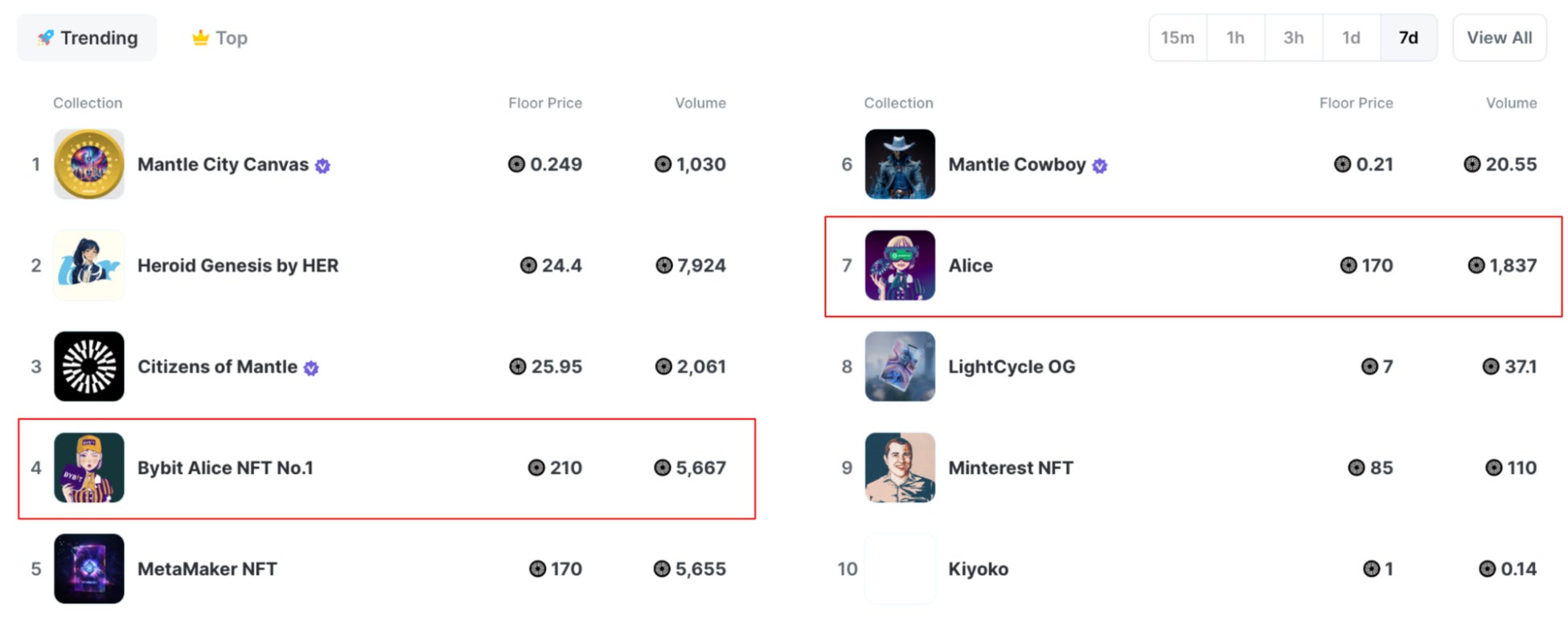 KeyNFTとして各NFTにユーティリティが付与されることで、価格が上昇し、取引量が増加するといったユースケースも確認され、Alice NFTシリーズは2のコレクションがMantle Network上で週間取引量TOP10にランクインしています。