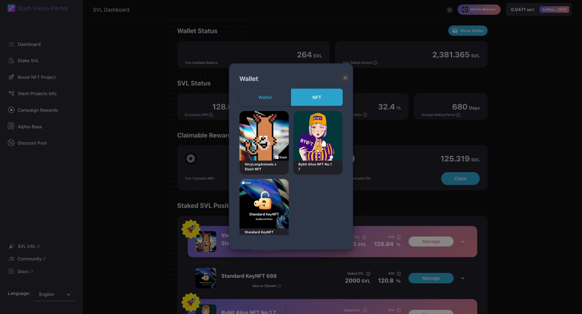 SVLエコシステムにおいては、Slash PaymentやSlash Cardの手数料収益の100%をMantle Networkのネイティブトークン「MNT」の買い上げに使用し、SVLをステーキングすることによって付与されるSVL TimeLock NFTの保有者にステーキング報酬として「SVL」や「MNT」は分配されます。