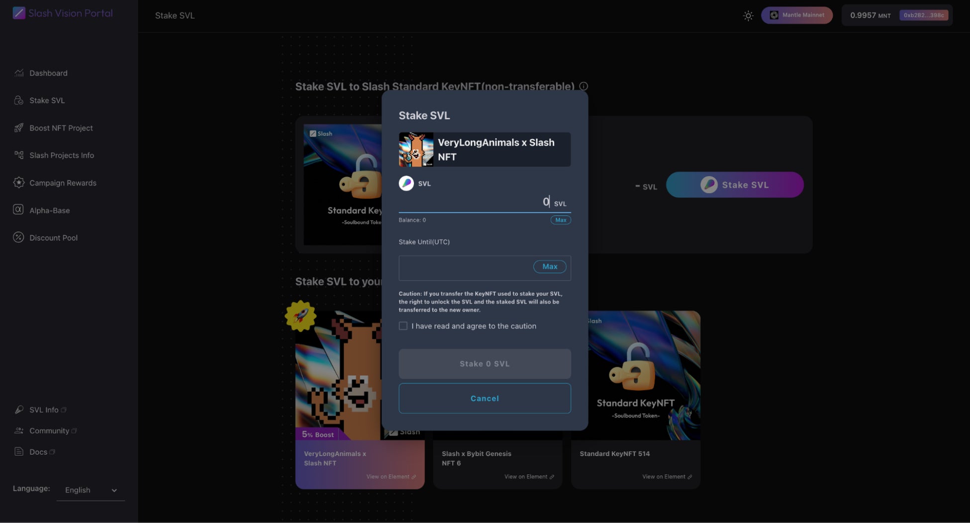 3 StakeページではKeyNFTを通じて、SVLをステーキングすることができます。