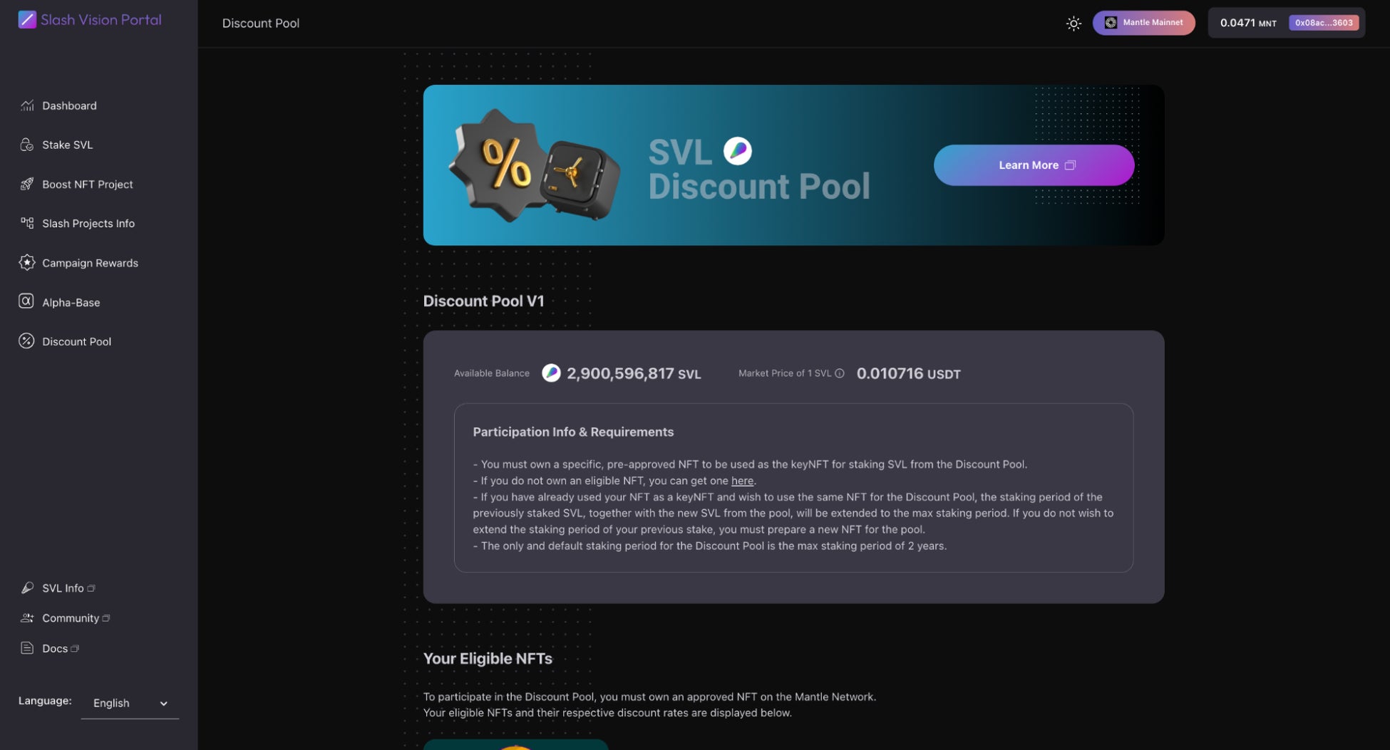 ・Discount Pool:KeyNFTを保有しているユーザーは、Discount PoolにプールされたSVLにアクセスでき、SVLの3日間の移動平均スポット価格から割引された固定価格でステークされたSVL ポジションを購入できます。 (割引率はユーザーが所有するKeyNFTによって異なります)