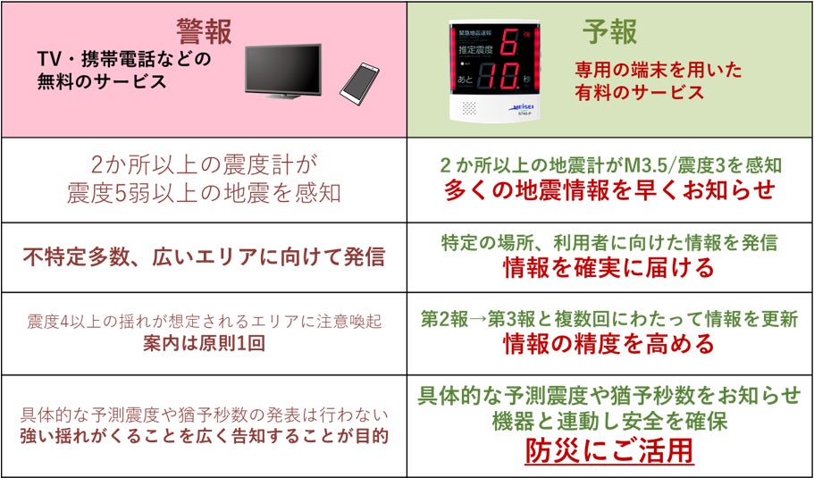 『予報』は、専用の端末を用いた有料のサービスで、揺れが来る前に推定震度と、実際に揺れが到達するまでの猶予秒数をお知らせします。