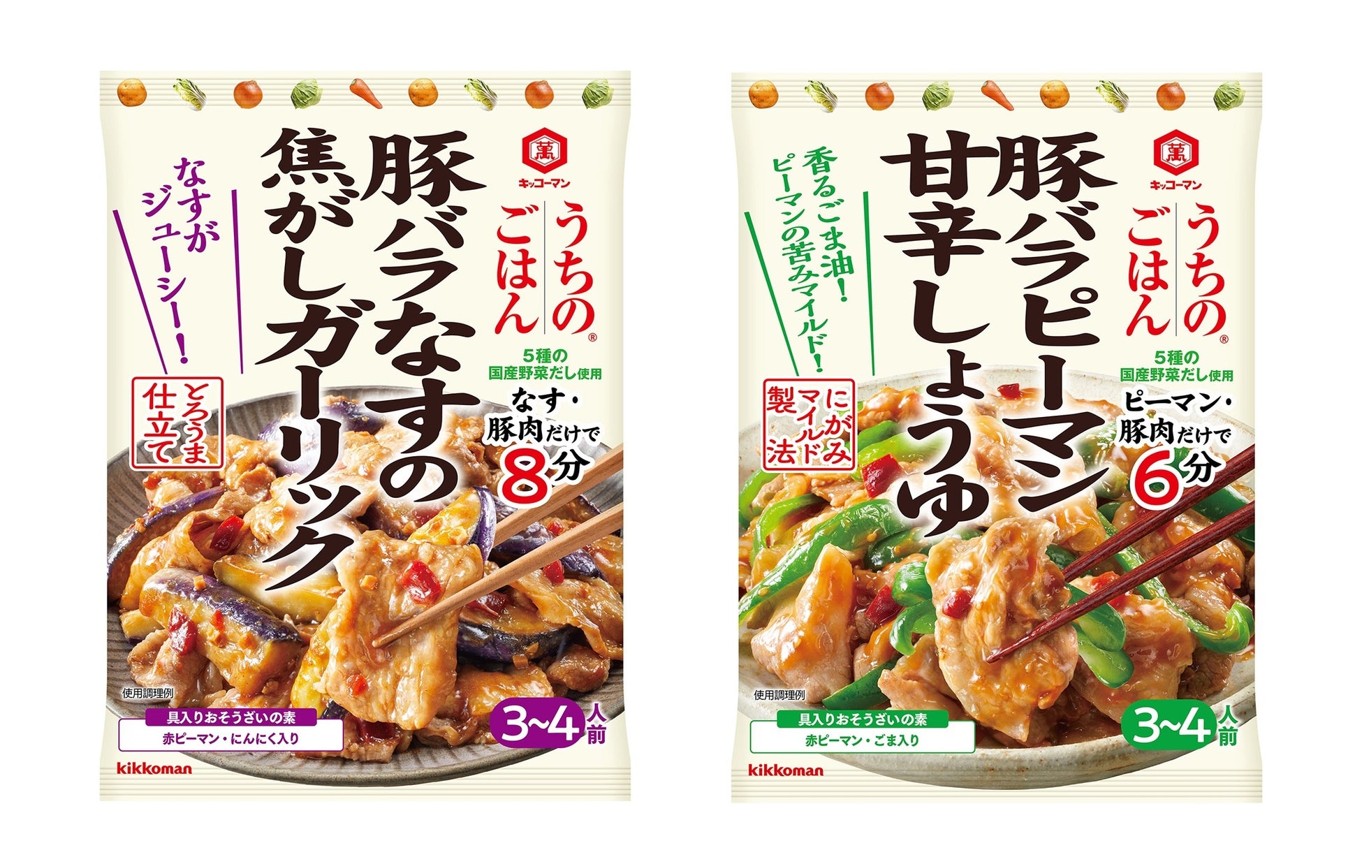 「うちのごはん 豚バラなすの焦がしガーリック」「うちのごはん 豚バラピーマン甘辛しょうゆ」新発売!