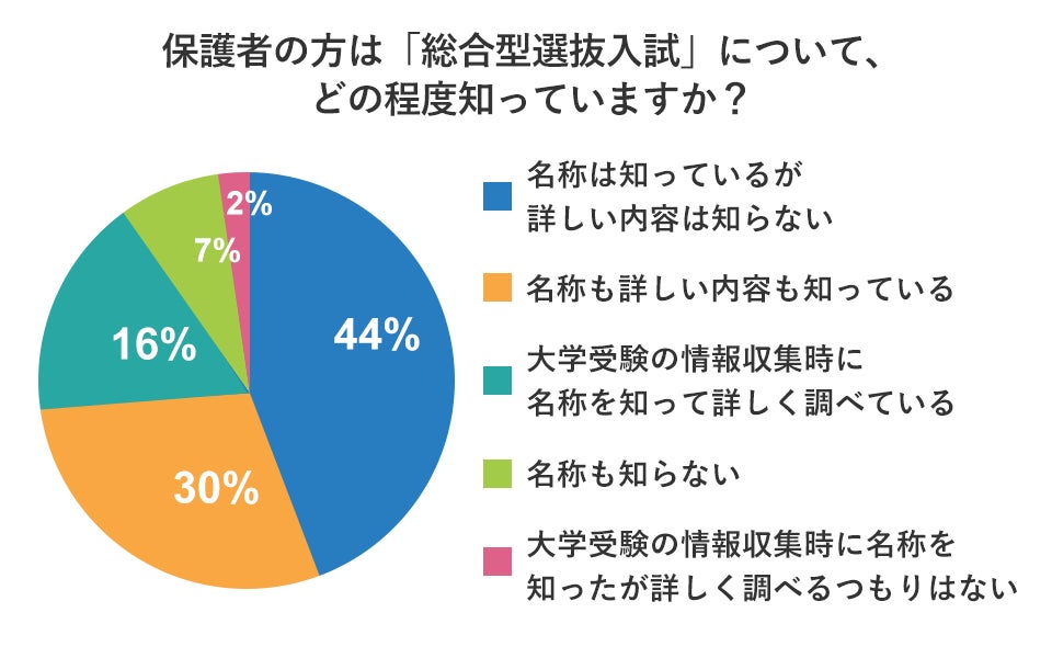実際に現役高校生の保護者に聞いたアンケートでも「総合型選抜入試」について「名前は知っているが詳しい内容は知らない」という回答が44%と最も多いという結果になりました。