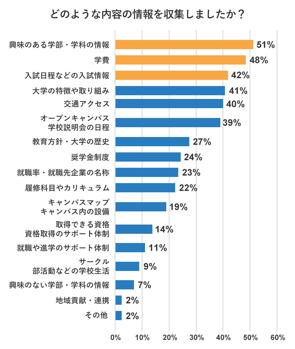 保護者が特に重視している情報についてさらに詳しくたずねたところ、「興味のある学部や学科の情報」が51%と最も多く、次いで「学費」が48%、「入試日程などの入試情報」が42%でした。保護者の多くが、子どもの進路選びにおいて将来の学びや費用の準備を重要視していることが伺えます。また、「大学の特徴や取り組み」(41%)や「オープンキャンパスの日程」(39%)も多くの保護者が注目しており、実際に大学の雰囲気を知るための機会を積極的に活用しているようです。
