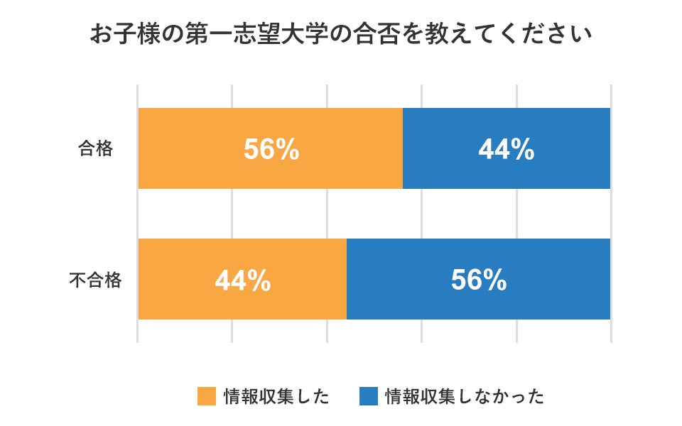 保護者の受験への関与度が子どもの大学合格にどう影響しているのかについても調べました。その結果、情報収集を行ったと答えた保護者の子どもの方が、情報収集を行わなかった保護者の子どもより約12%多く第一志望の大学に合格していることが分かりました。