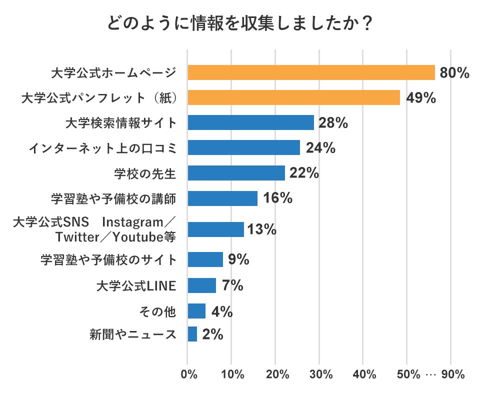 では、受験生の保護者はどこで情報を集めているのでしょうか。調査結果によると、大学受験の情報収集で保護者が最も頼りにしているのは「大学の公式ホームページ」(80%)と「大学の公式パンフレット」(49%)でした。まずは公式から出ている情報を確認し、足りない部分について各々深掘りしていくというスタイルが多いようです。