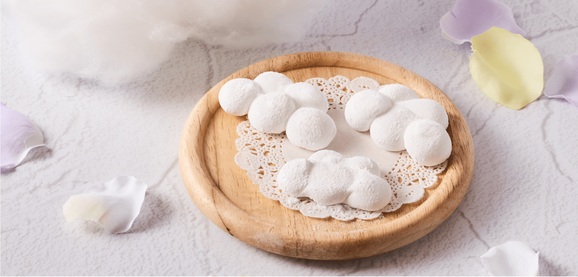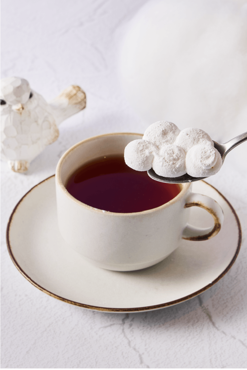 「雲」を模った、ふわふわもちもち食感のギモーヴ。そのまま召し上がるのはもちろん、ホットドリンクにそっと浮かべて。ゆっくりと溶けてゆく様子を眺めながら、心解き放たれるドリーミーなひとときをお過ごしください。