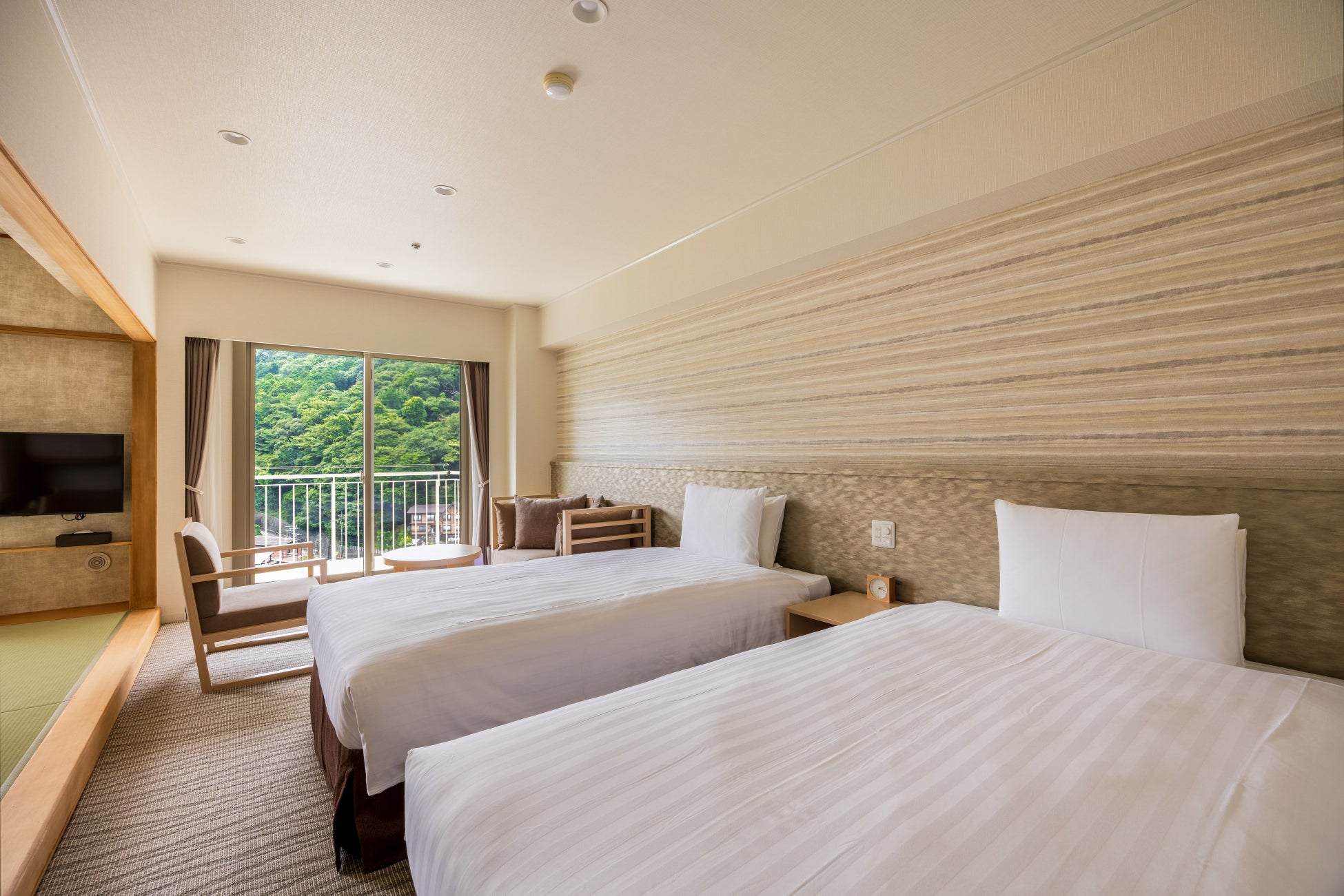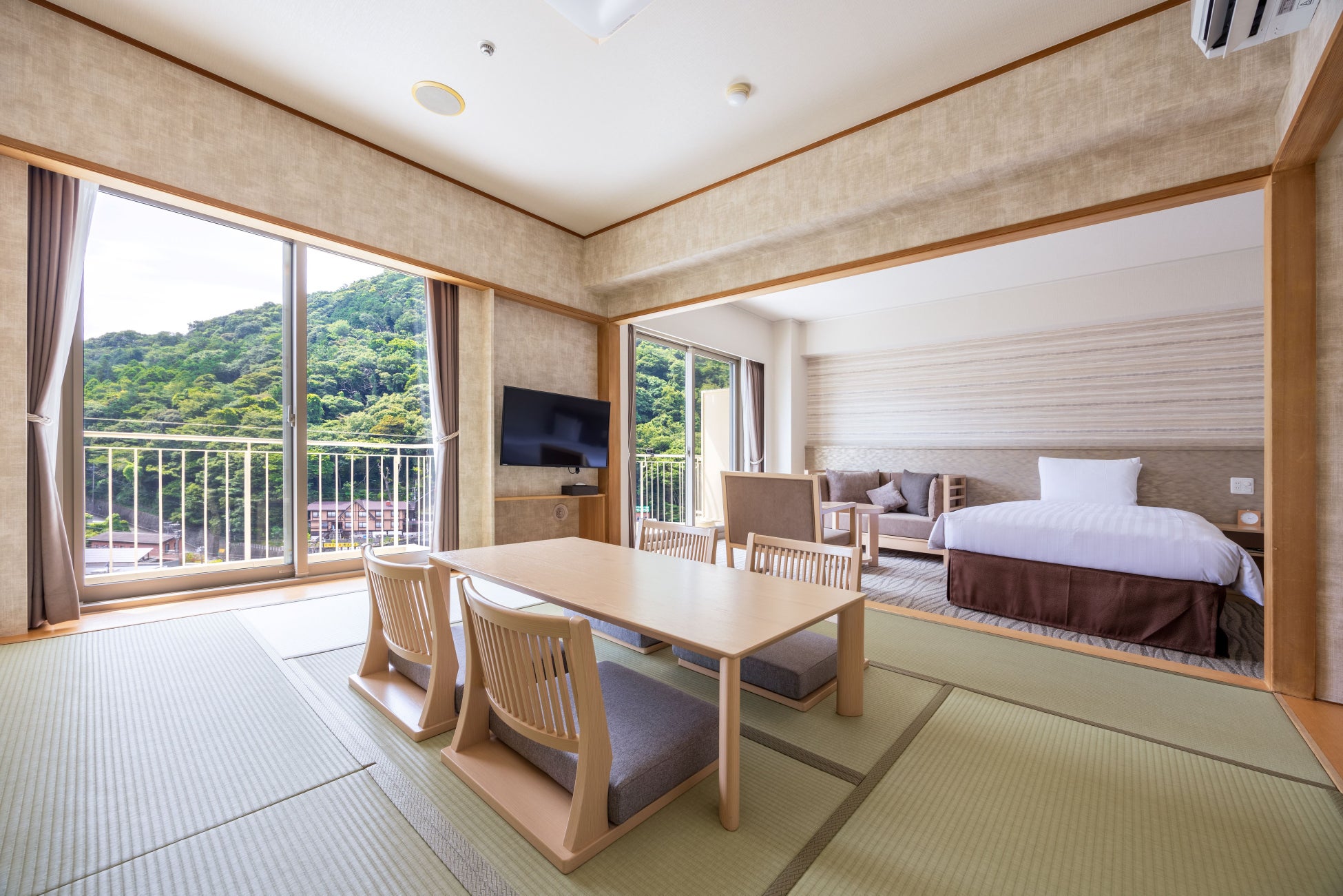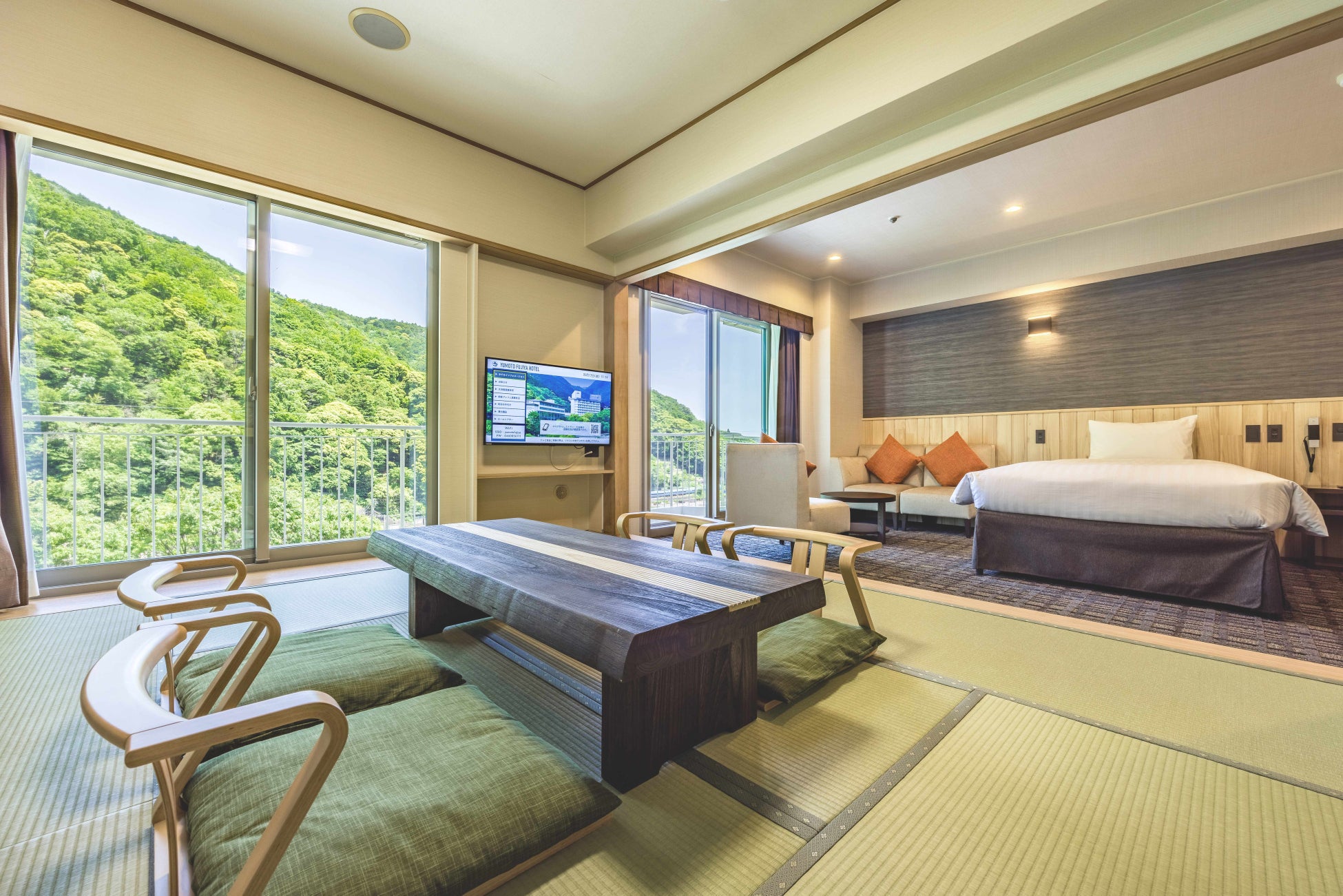 機能面では、それぞれ独立した洗面台、トイレ、バスルームの新装、個別空調への変更、サッシ交換による断熱、遮音性の向上など居住性への充実を図りました。最大6名までご滞在が可能、利用シーンや人数に応じてフレキシブルにご利用いただけますので、ご家族や友人グループなど幅広いシーンでのご旅行におすすめです。また、和室の雰囲気とベッドの快適性を兼ね備えた和洋室は、海外のお客様からも人気が高い部屋タイプです。箱根の山々を望む48㎡の広々とした客室で穏やかなひとときをお過ごしください。