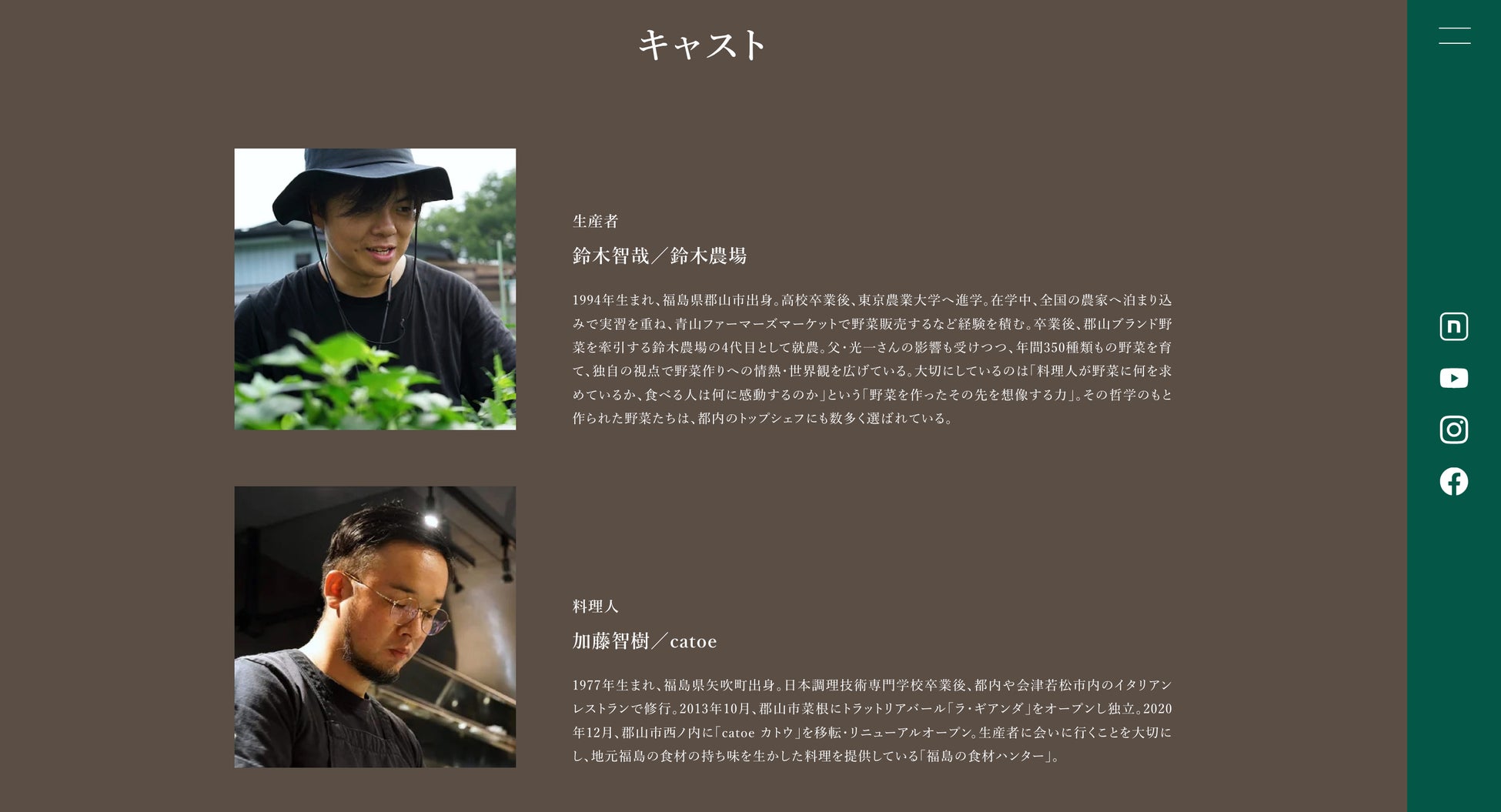 特設WEB サイトでは、本編ムービーのほか、登場⼈物のプロフィールやゆかりの⽅々からのコメントを掲載。さらに、郡⼭の農産物が購入できるお店や⾷べられるお店、郡⼭の農と⾷を豊かにする取り組みなども紹介しています。
