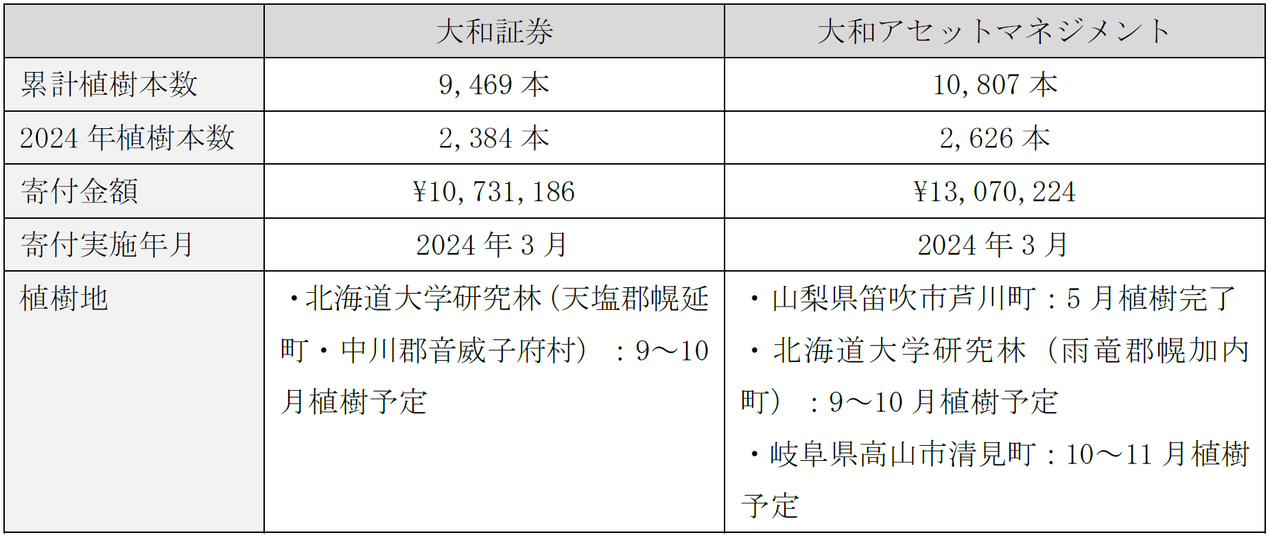 開示 | ・大和証券グループ本社と大和アセットマネジメントのHP上で、寄付の実績 (日付、寄付額)をご報告 ・大和アセットマネジメントが発行する対象ファンドのファンドレターで植樹活動や森が育つ過程をご報告 |