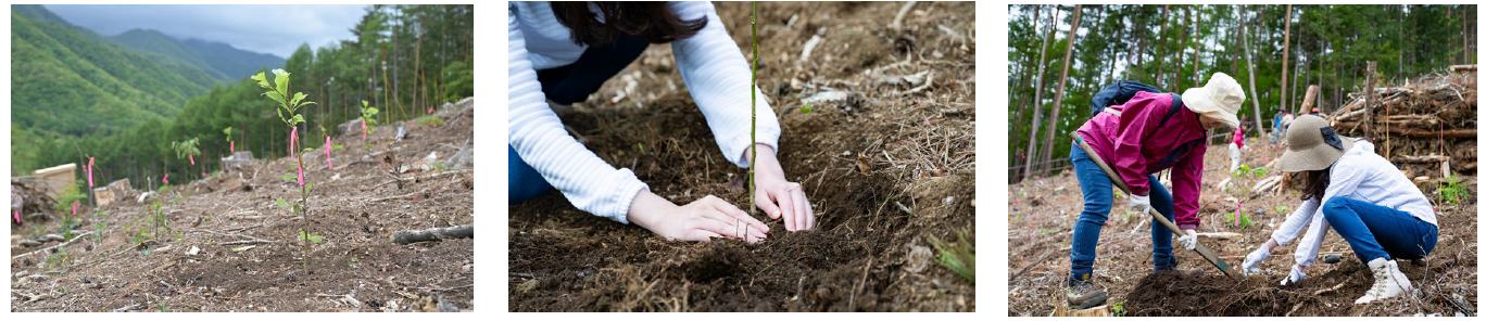 植樹活動 | 認定NPO法人環境リレーションズ研究所が運営する植樹プロジェクト「Present Tree」を通じて、各植林地の森林組合等が実施 |