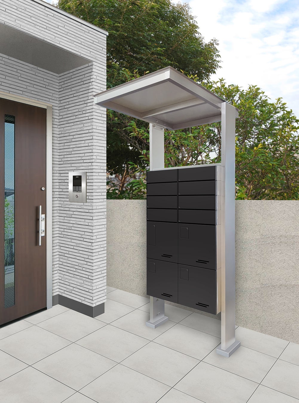 壁付け固定できない場所への設置が可能で、集合住宅外構部の有効スペースを活用して自由に配置できます。自立設置型のため、新築・リニューアルともに対応可能です。